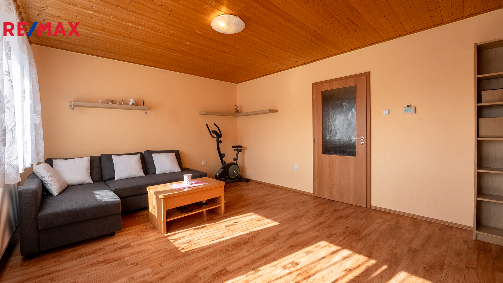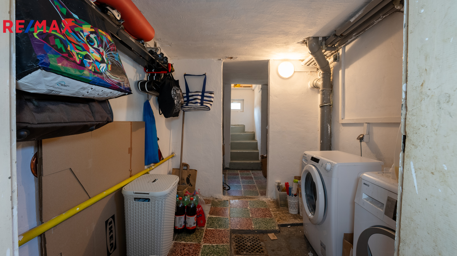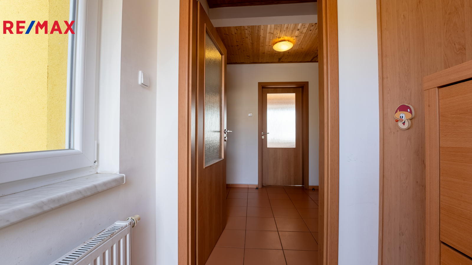Dispozice domu nabízí praktické uspořádání místností, přičemž velký podkrovní pokoj je ideální například jako dětský pokoj, herna nebo pracovna. V domě se nachází jedna koupelna a dvě WC, což zvyšuje komfort pro vícečlennou domácnost. Nemovitost je částečně podsklepená a nabízí tak další úložné či technické zázemí.