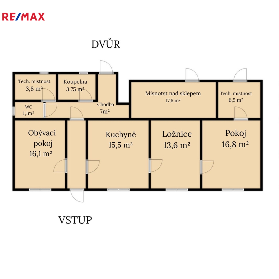Dispozice domu zahrnuje tři obytné pokoje (16,1 m², 16,8 m² a 13,6 m²), kuchyni o velikosti 15,5 m², dále chodby, koupelnu (3,75 m²) a samostatné WC. Součástí domu je také sklep (13,4 m²) a další prostor nad sklepem o velikosti 17,6 m², který nabízí praktické využití například jako sklad.
