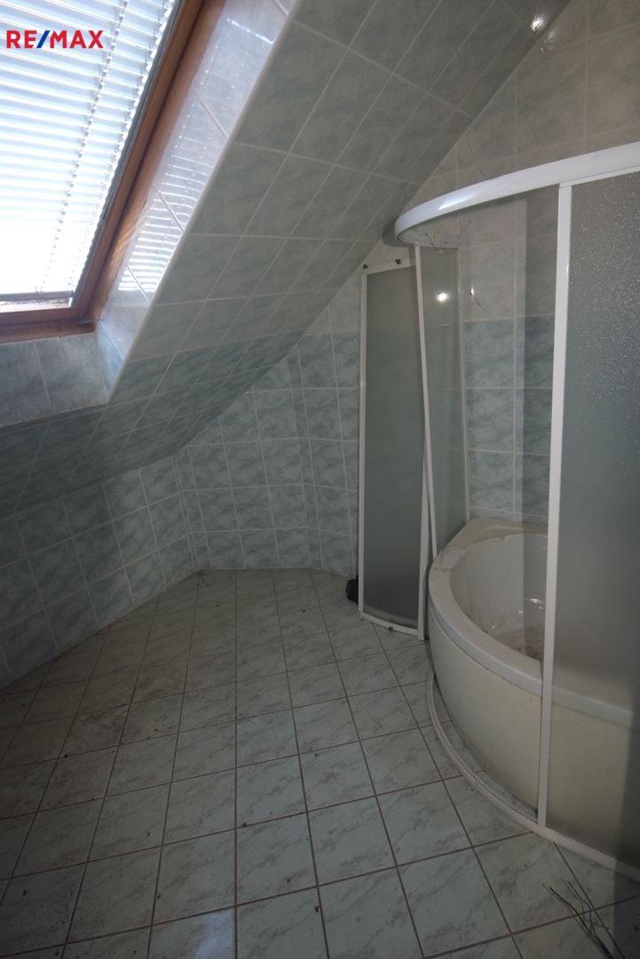 V podkroví jsou dvě ložnice, které jsou dodělány a využívány. Do budoucna se zvažovalo další využití podkroví. Z tohoto důvodu je předpřipravena další část, tedy koupelna se sprchovým koutem a přípravou na WC a k vlastnímu bydlení je zde místnost cca 40m2 s přípravou na kuchyňský kout. Po drobné úpravě je možné vše upravit jako samostatnou bytovou jednotku.