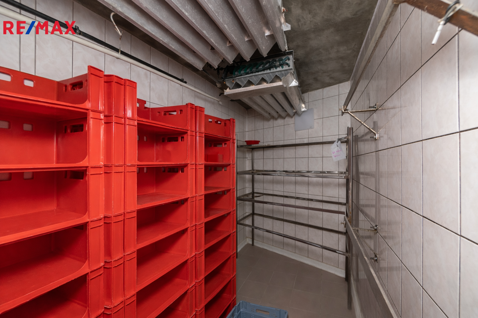 Samotná prodejna 1.NP (zastavěná plocha 283,90 m2, užitná plocha 220 m2) je nyní koncipována jako provozovna-prodejna maso-uzeniny s technickým zázemím pro vlastní provoz, skladování a činnost. Celý prostor je kompletně chlazený, a to již od nákladové rampy. Certifikovaná provozovna pro bourárenskou (červeného a bílého masa) a výrobní činnost vč. skladování. Prodejna je kompletně vybavena vč. skladově-pokladního systému, vážného systému vah do PC, datových rozvodů a kamerového systému a kompletního strojního vybavení pro výrobu a expedici masa.