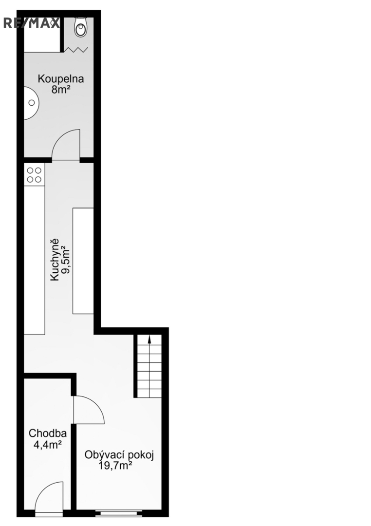 Přízemí tvoří moderní obývací pokoj s kuchyňským koutem a koupelna s toaletou.