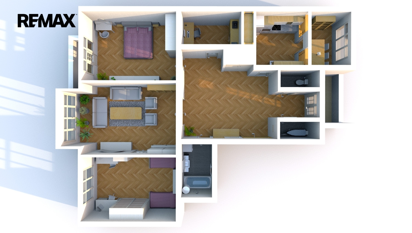 Dispozice nabízí komfortní bydlení i pro náročnější klienty – prostorné místnosti, které dávají dostatek soukromí i variability využití. Najdete zde tři pokoje, prostornou halu, pokojík "pro služebnou", kuchyň a koupelnu.