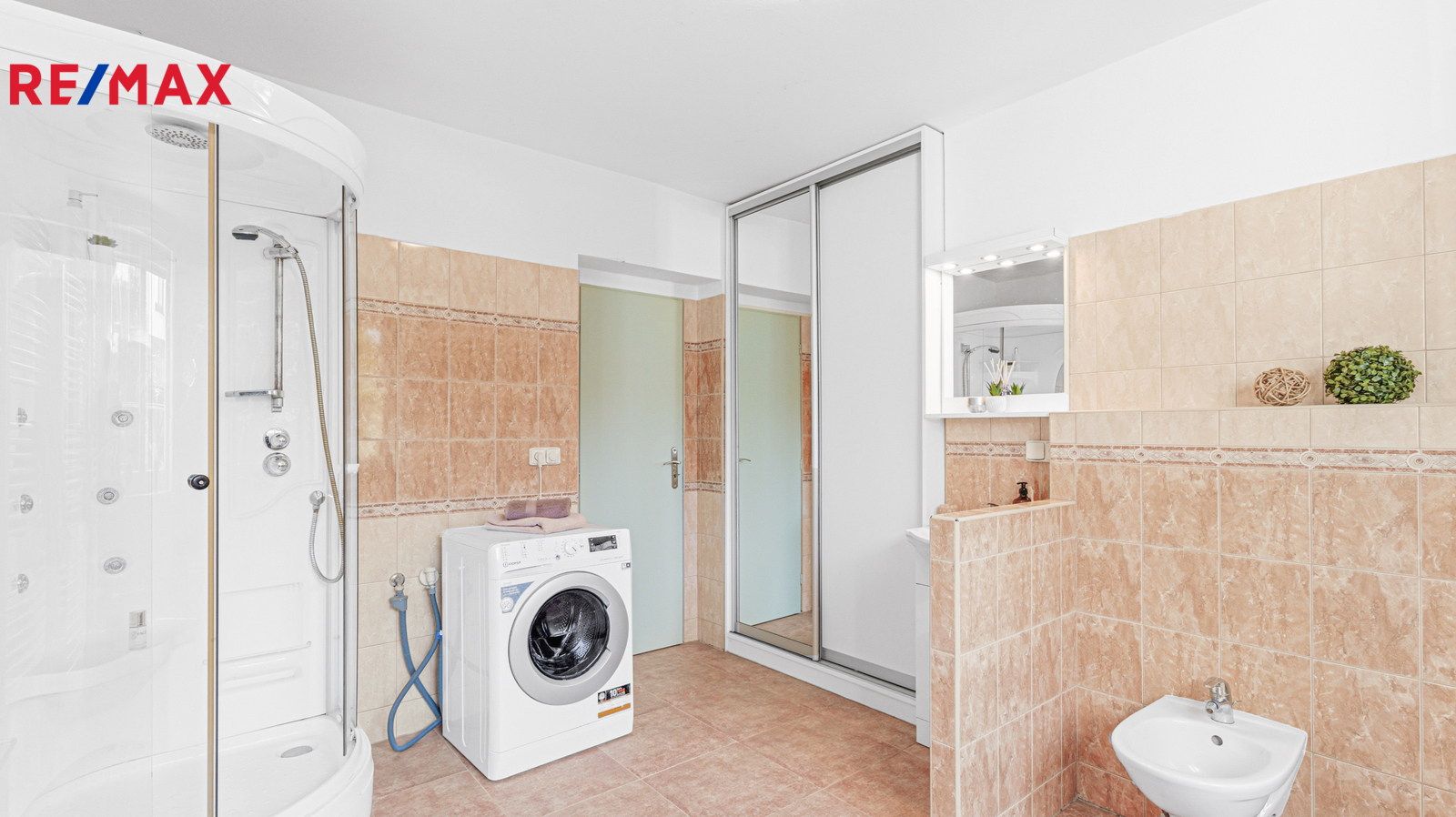 Dominantou obytné části je prostorný obývací pokoj s krbem a jídelním koutem, který je propojen s kuchyní. Součástí domu je také koupelna se sprchovým koutem a WC, kde je instalováno elektrické podlahové vytápění pro vyšší komfort.