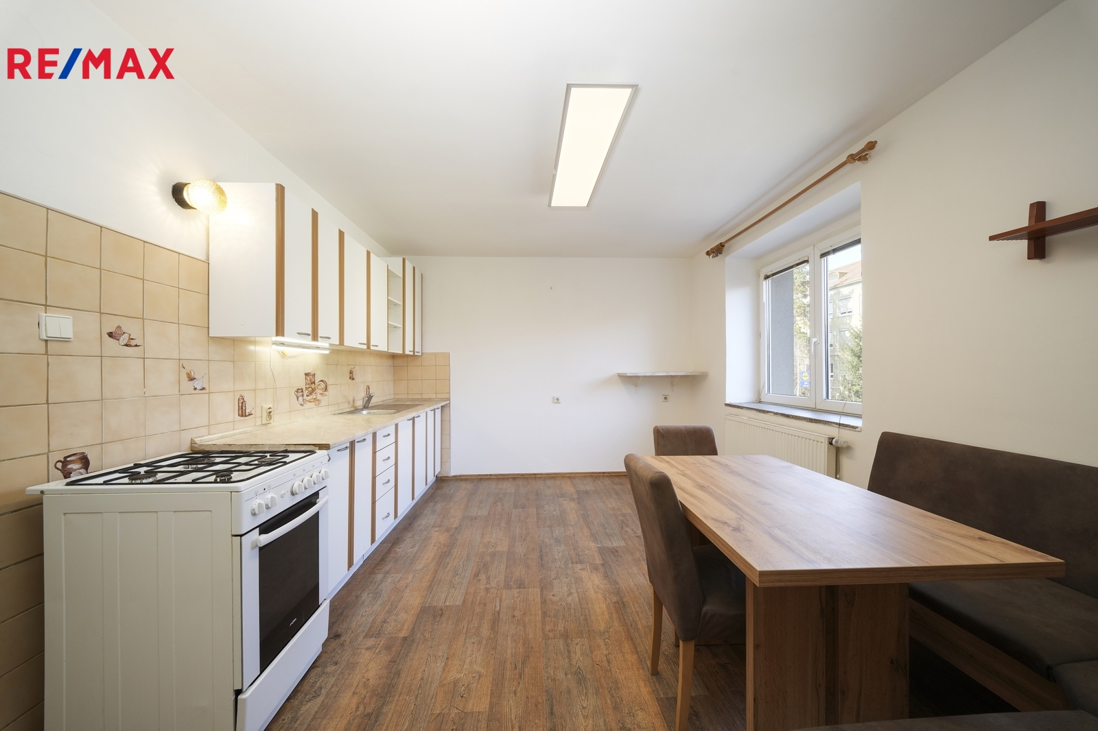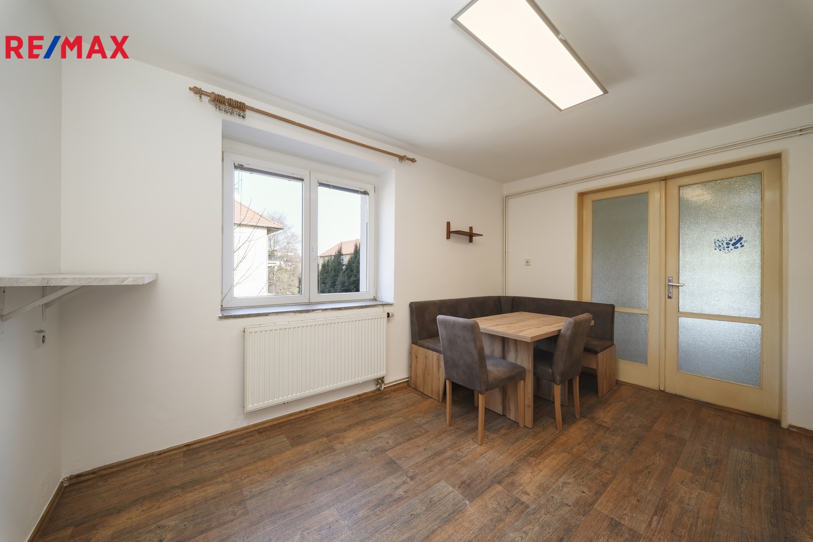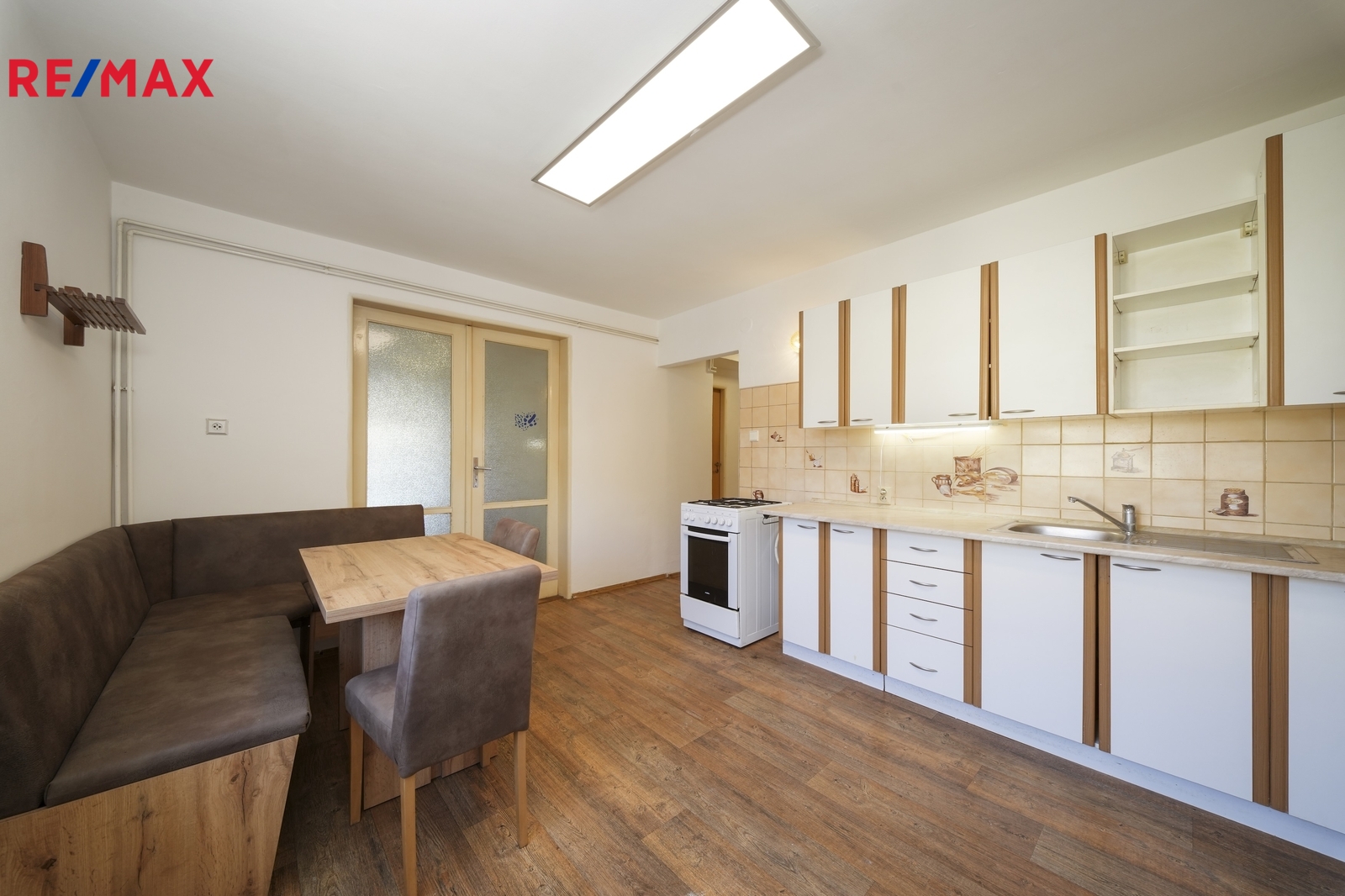 Dominantou bytu je prostorná kuchyně s jídelním koutem, která je stylově propojena s obývacím pokojem prostřednictvím dvoukřídlých dveří.