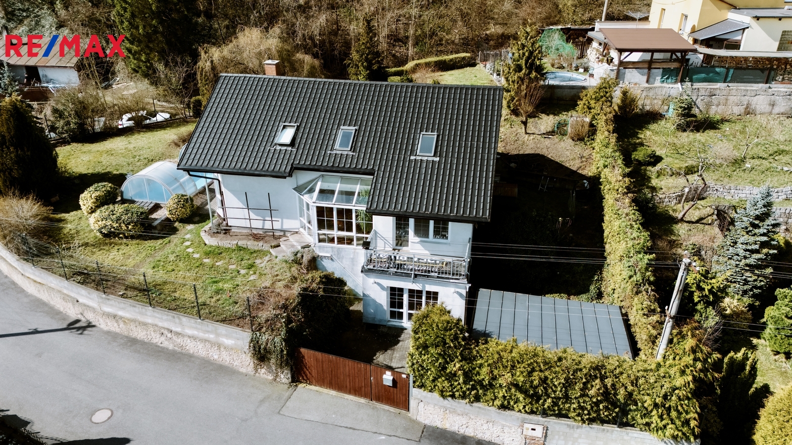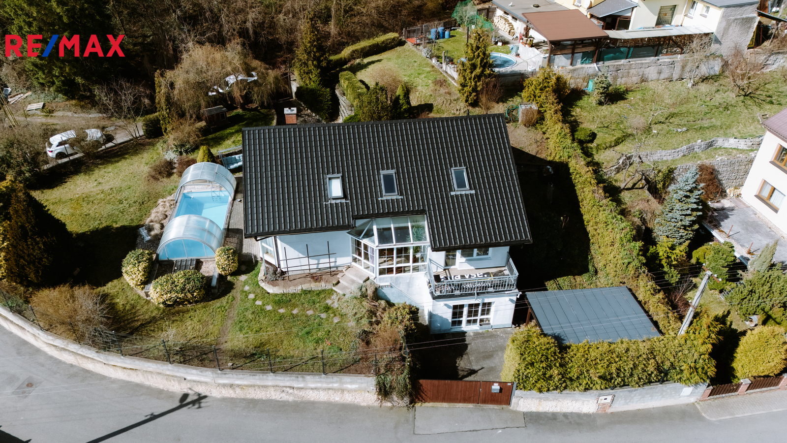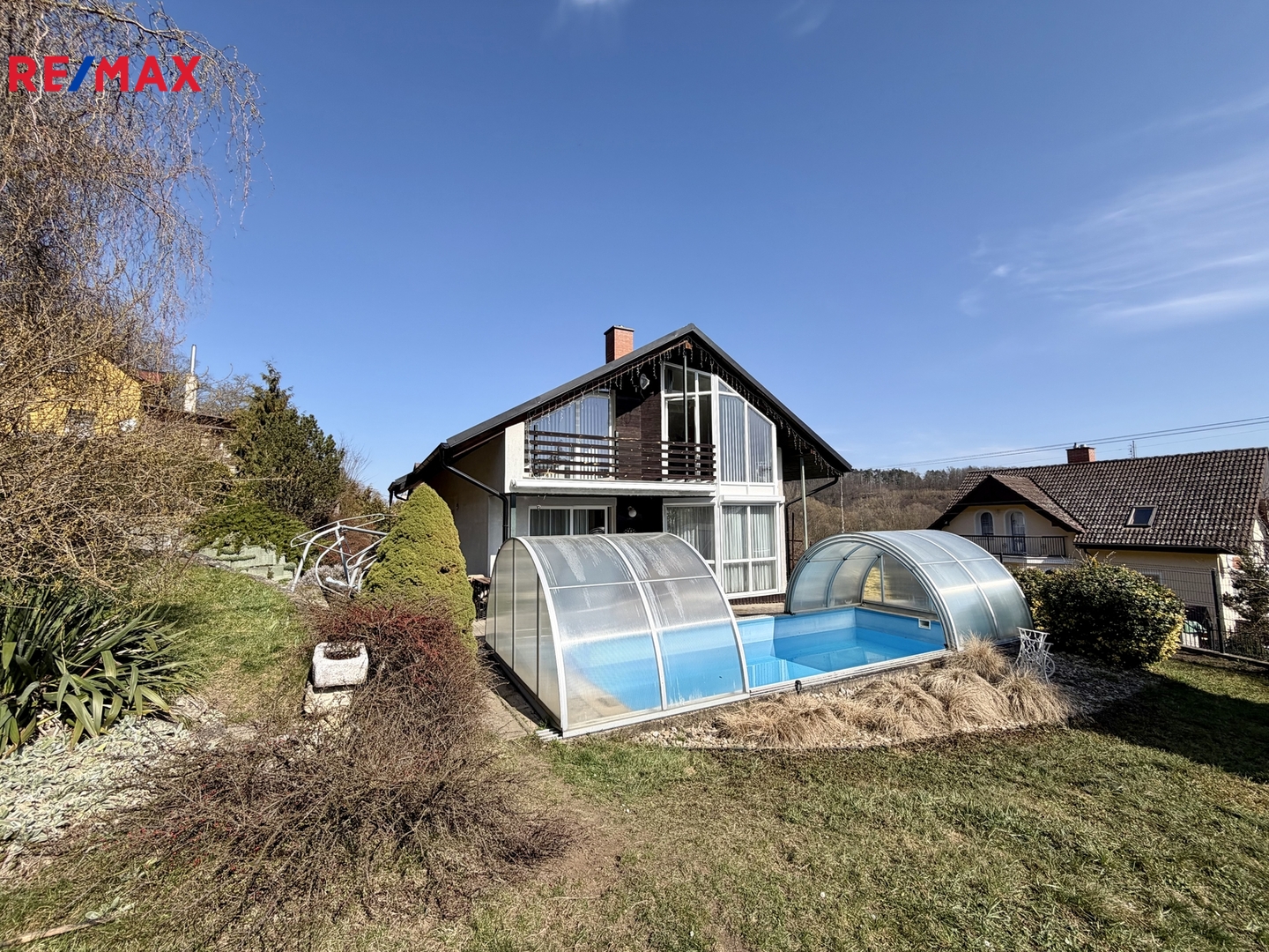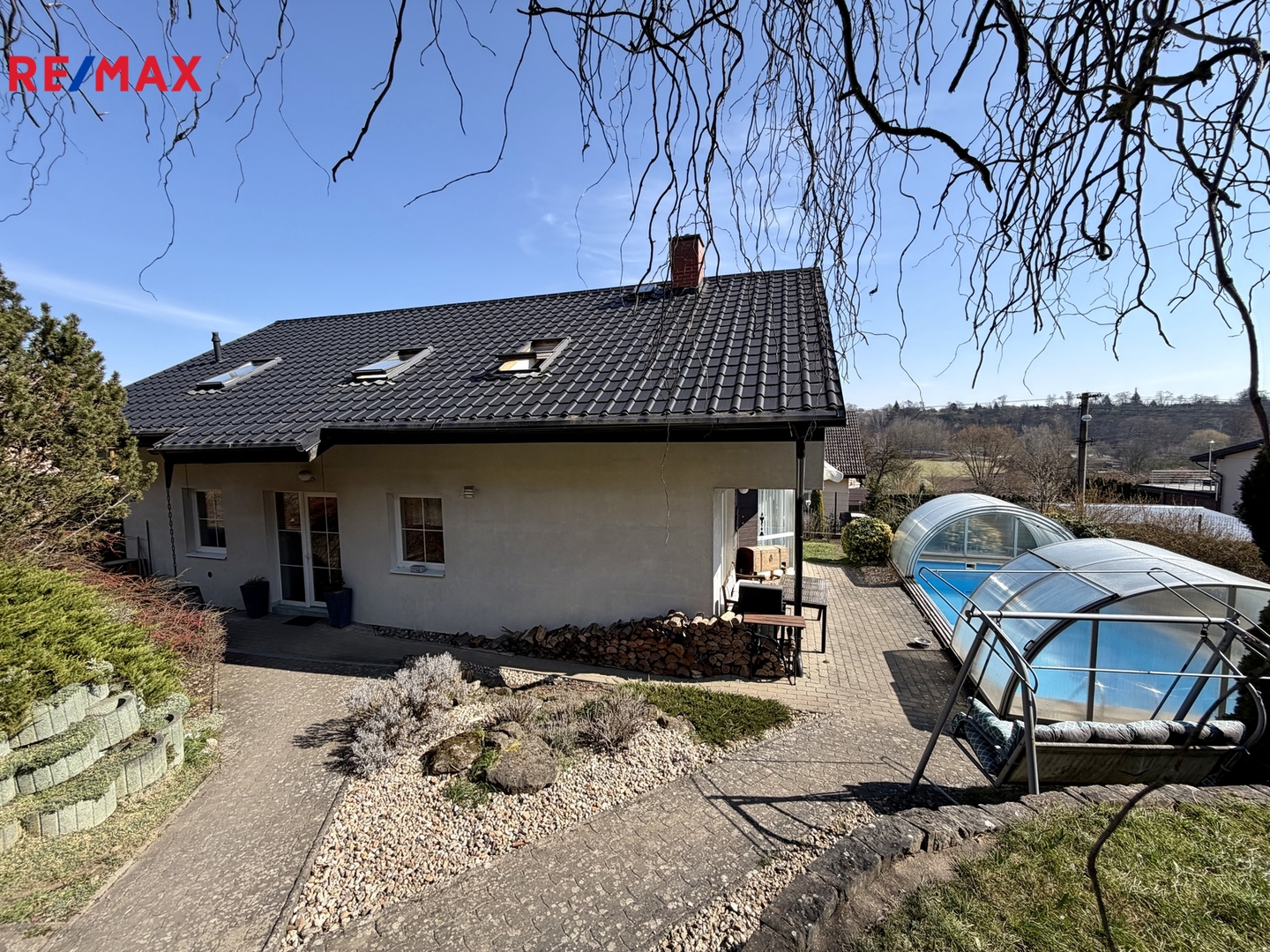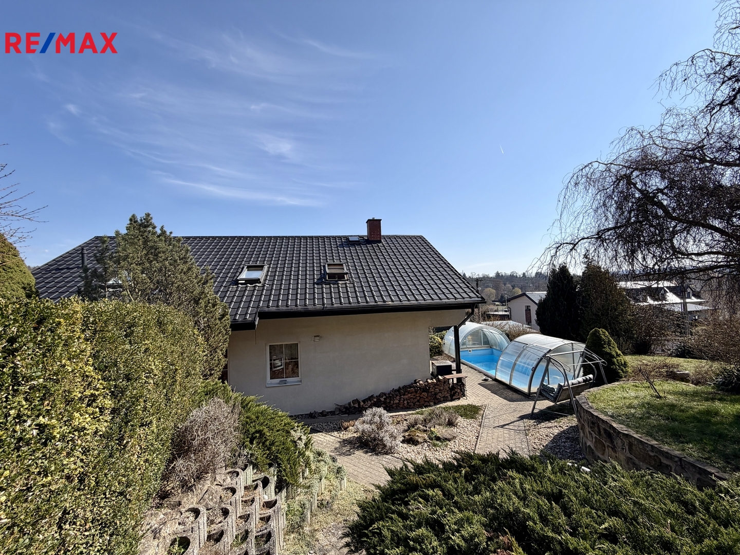 Dům je z roku 2000, ale průběžně bylo investováno do jeho úprav (nová hliníková střecha SATJAM, střešní okna Velux, garážový přístřešek, vyvložkování komínu, nová fólie v bazénu,...).