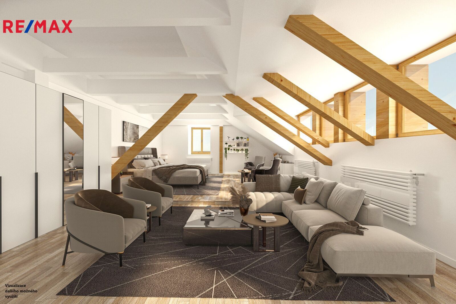 3. NP: Stylový otevřený podkrovní prostor s kuchyňským koutem a samostatným WC.