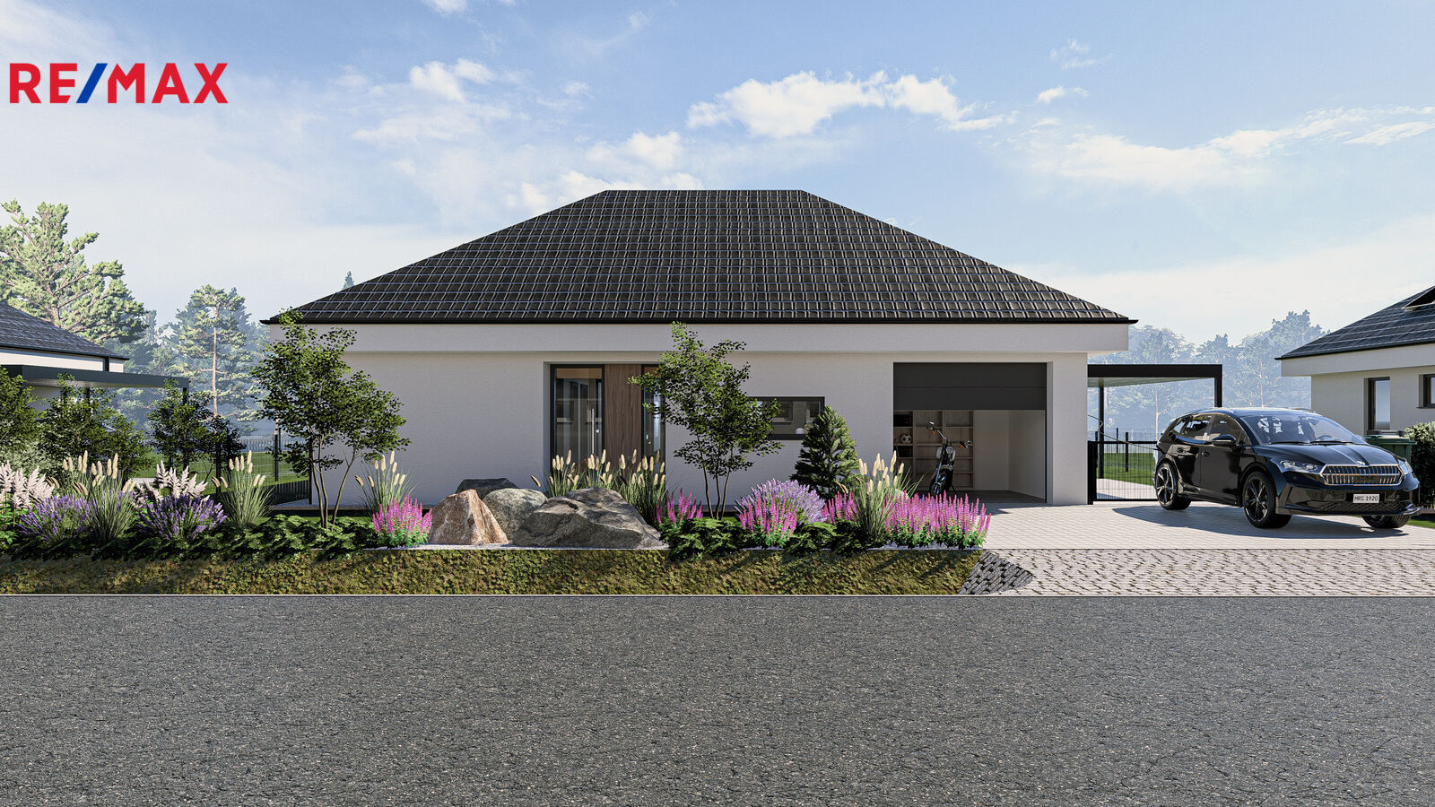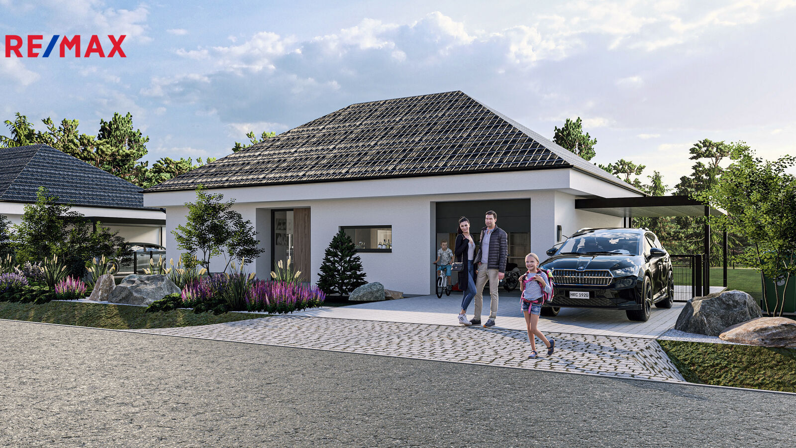 Vjezd tvořen ocelovou pásovinou a žulovými kostkami. 2 park. stání pokrytá betonovou dlažbou, předzahrádka ozdobená okrasnou zelení, solitérním stromem, kameny i osvětlením se soumrakovým systémem, vyhrazená plocha pro popelnice. 3. park. stání, které je zastřešené a vybavené třífázovou zásuvkou pro nabíjení elektromobilu. Tento prostor je chráněn dvoukřídlou bránou.