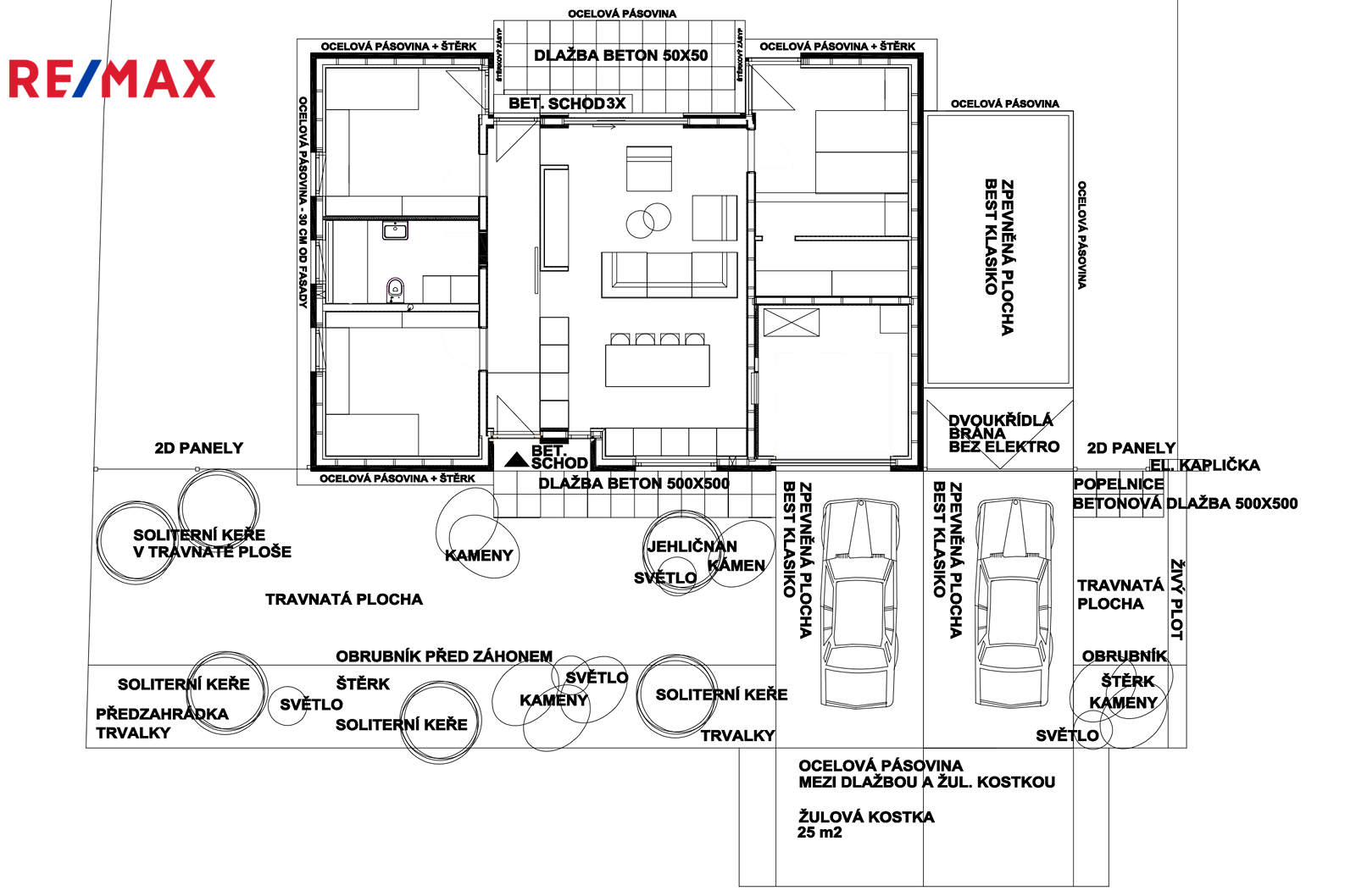 Přední část pozemku je chráněna antracitovými panely, zadní je oplocena svařovaným pletivem. Vstup do domu je řešen chodníkem a vstupní výklenek pískovaným betonovým schodem.
