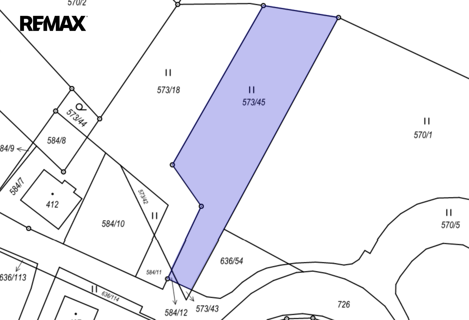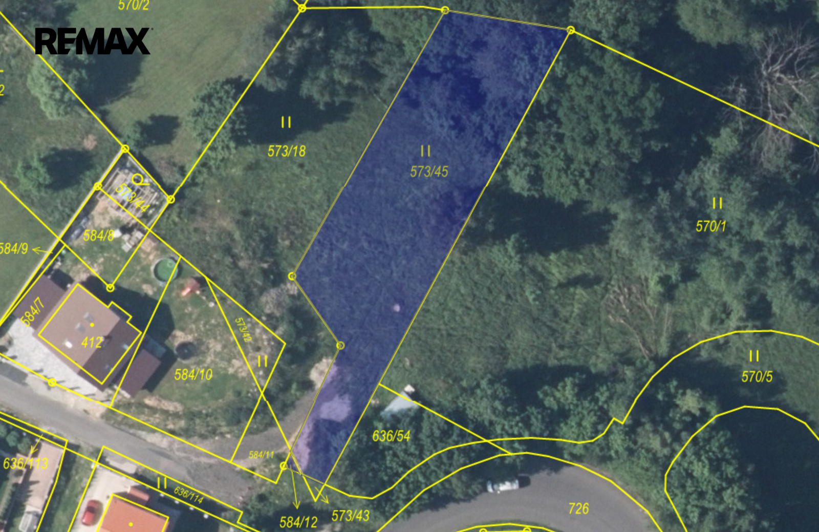 Hlavní pozemek parc. č. 573/45 o výměře 1 104 m² je dle platného územního plánu zařazen do plochy BI – bydlení individuální. Tato plocha je určena pro výstavbu samostatně stojícího rodinného domu venkovského či příměstského charakteru. Na přiložené fotografii je vyznačeno ochranné pásmo lesa, ve kterém není možné realizovat výstavbu rodinného domu.