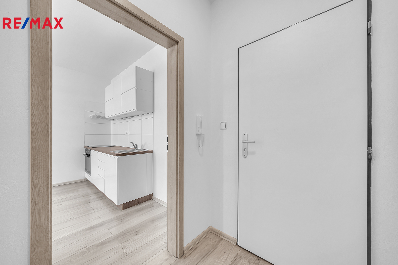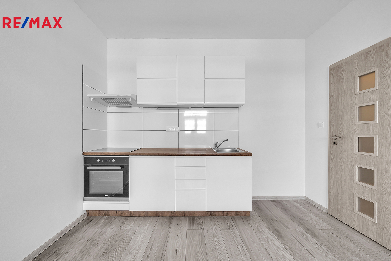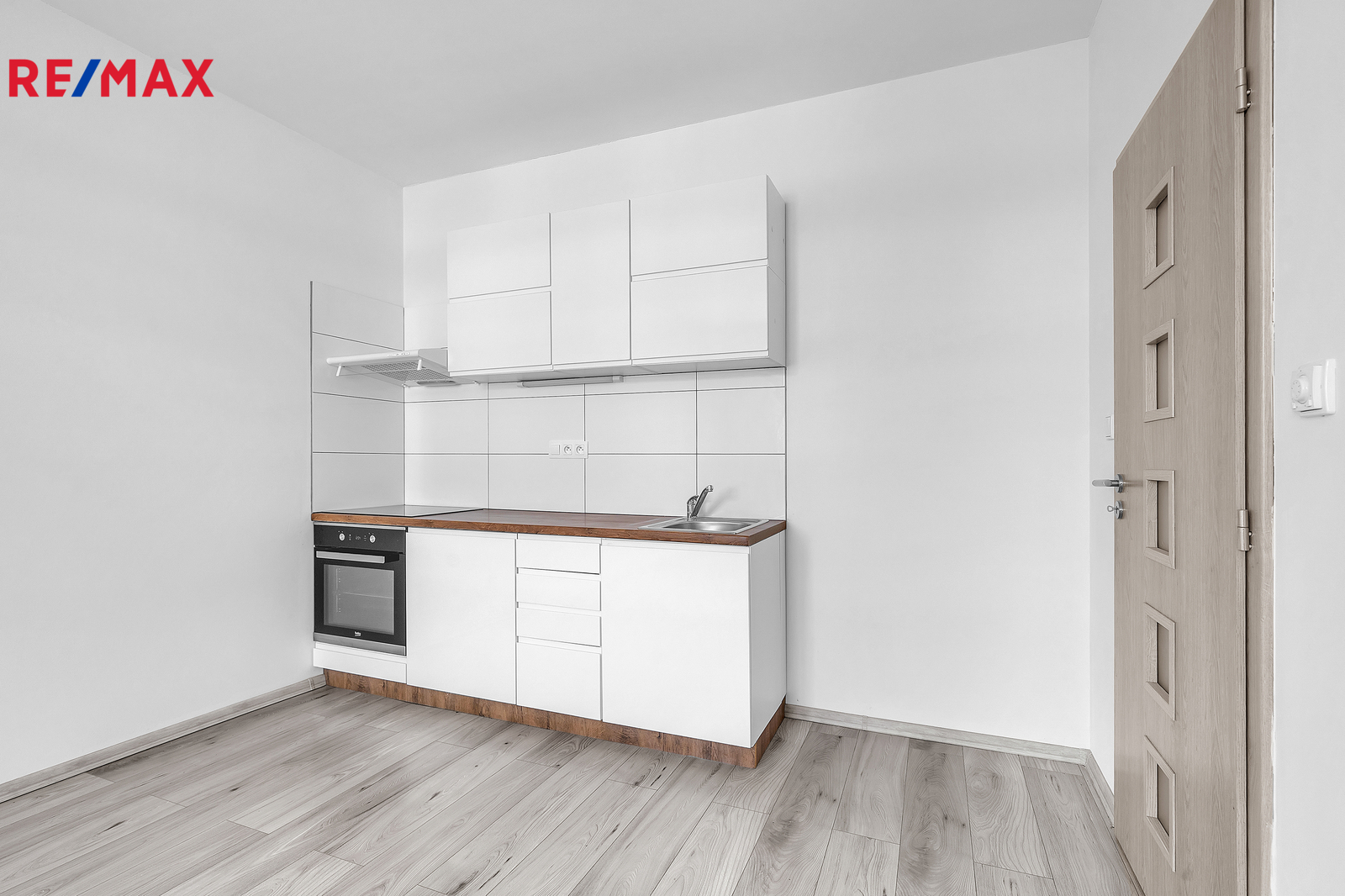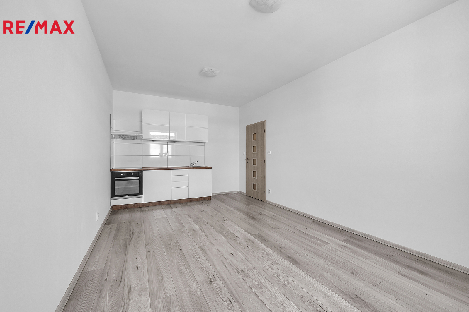 Interiér bytu je vybaven funkční kuchyňskou linkou, která obsahuje dřez, troubu, sklokeramickou desku a digestoř. Dále je zde prostor pro lednici, což zajišťuje dostatek místa pro pohodlné vaření a každodenní využití kuchyně. Z chodby je vstup do koupelny, kde je sprchový kout, toaleta, umyvadlo se zrcadlem a odpadem na pračku. Byt je ideální pro jednotlivce nebo pár, kteří preferují jednoduché, ale komfortní bydlení.