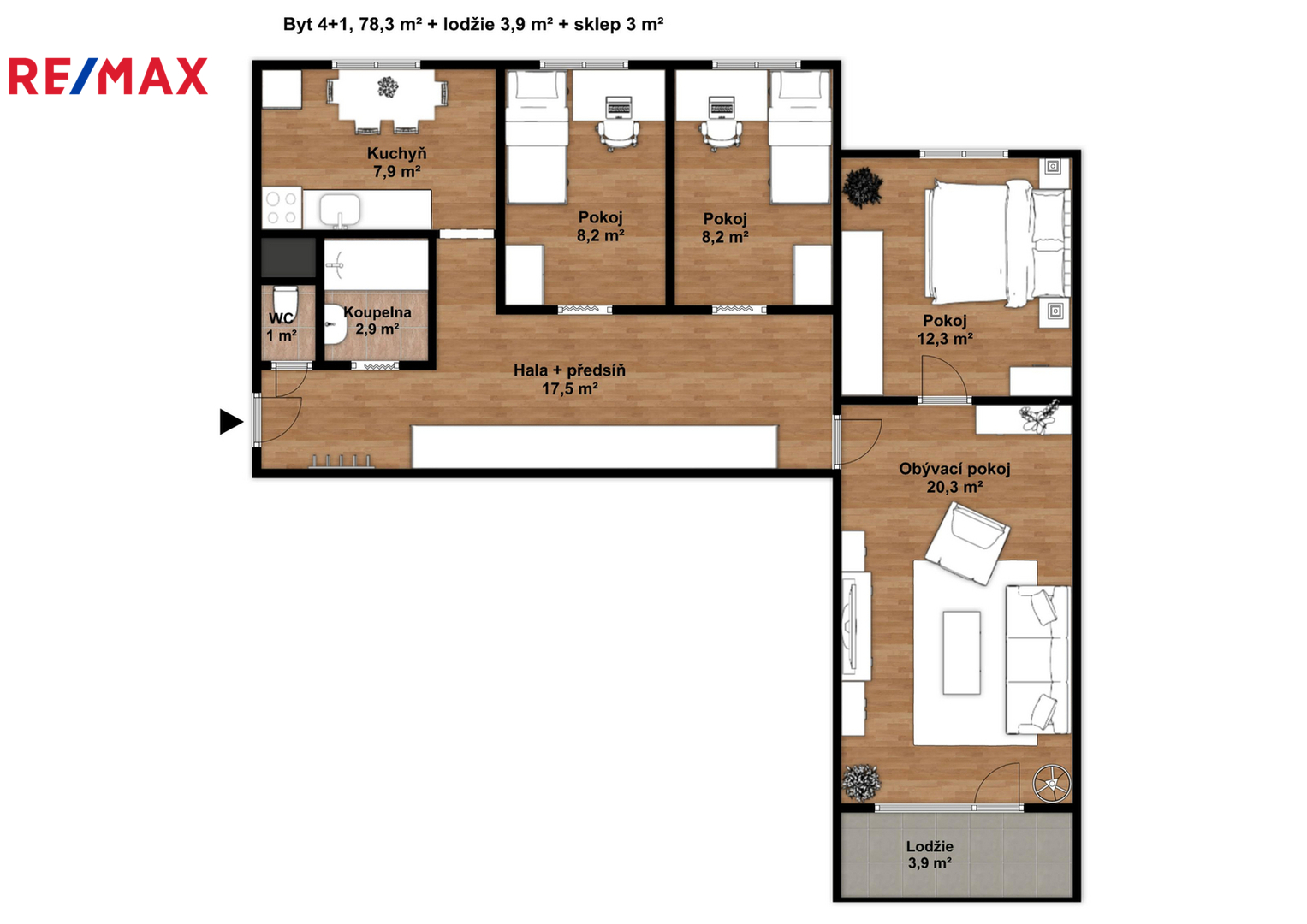 K bytu náleží lodžie o velikosti 3,9 m² a sklep 3 m². Podlahová plocha samotného bytu činí 78,30 m².