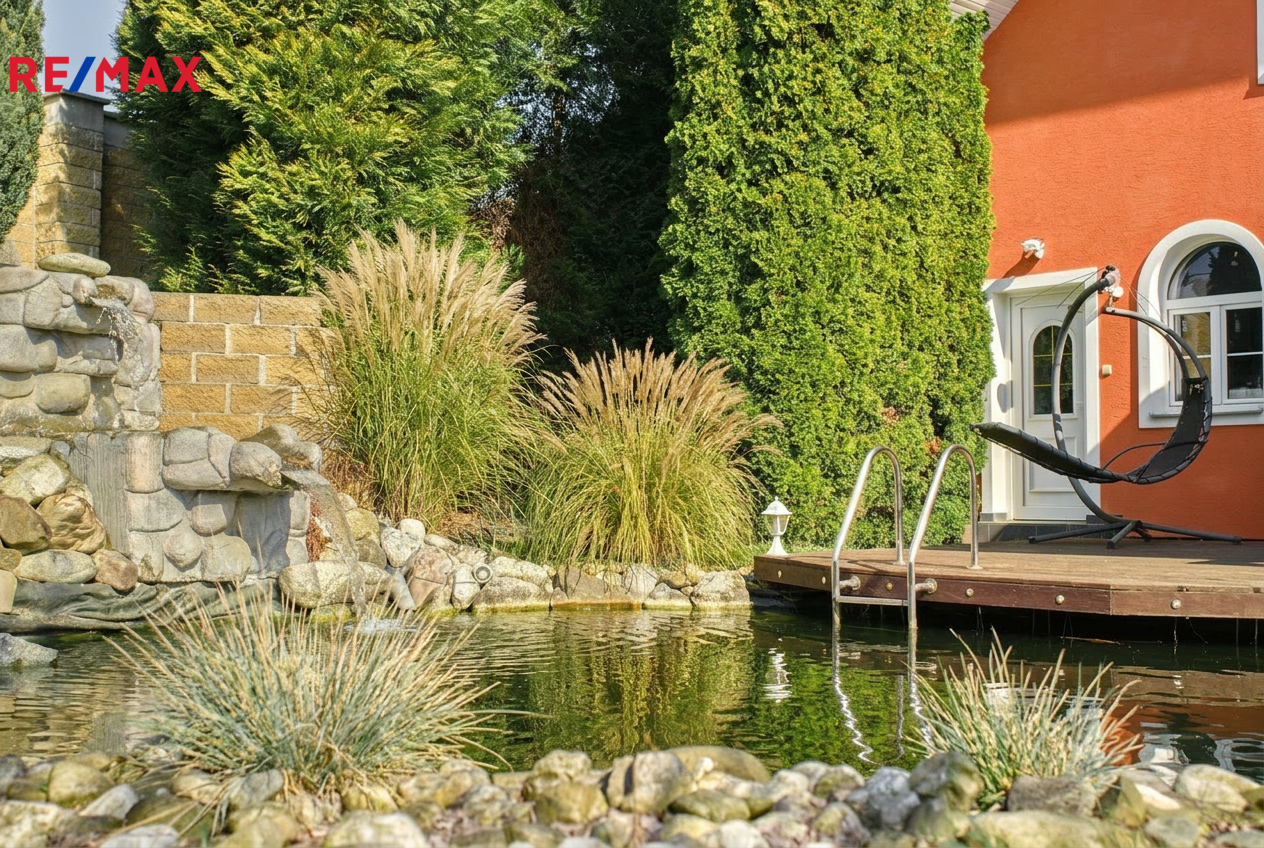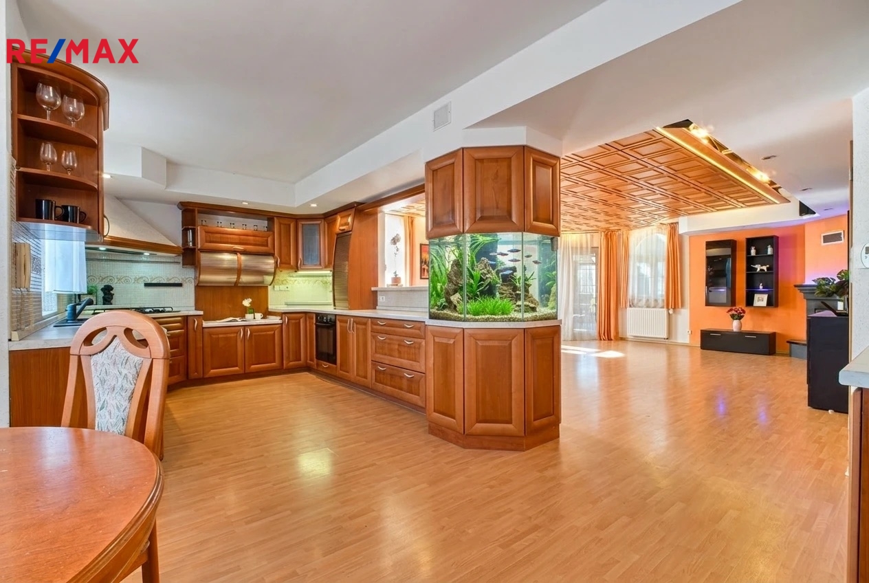 Srdcem domu je velký obývací prostor s kuchyní o velikosti cca 55 m², který přirozeně propojuje interiér se zastřešenou terasou a zahradou s jezírky. Tento prostor je ideální pro rodinné chvíle i setkávání s přáteli.