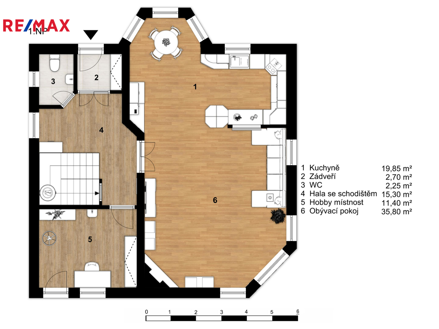 V přízemí se nachází vstupní část a hlavní obytný prostor s kuchyní, přímým vstupem na terasu a zahradu. Dominantou je také krb s rozvody tepla do celého domu, který výrazně snižuje náklady na vytápění.