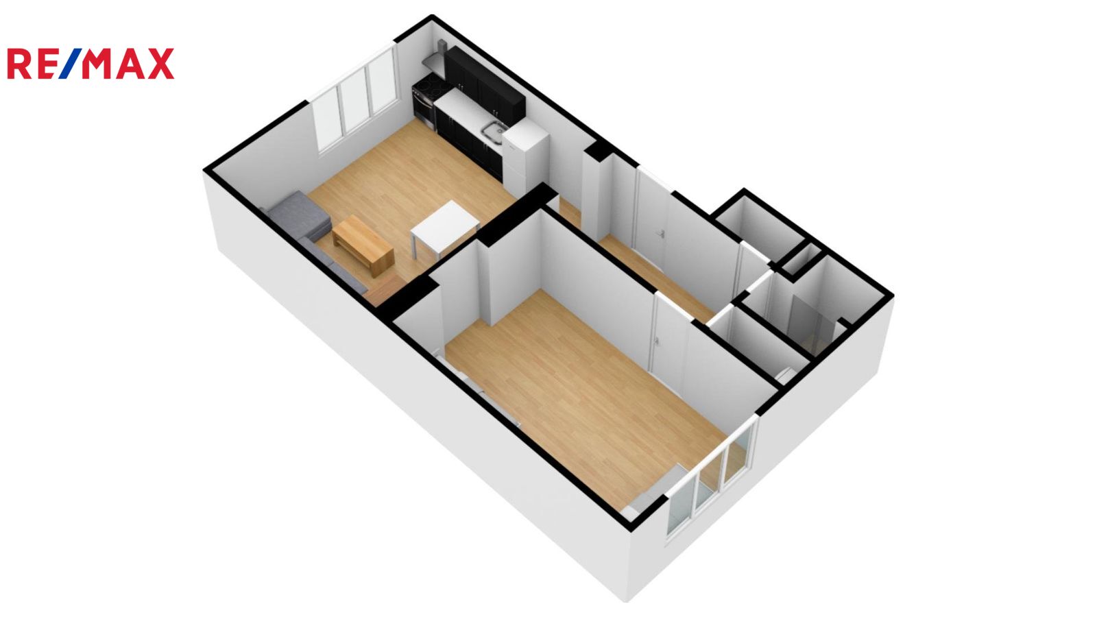 Byt je členěn na obývací kuchyň (cca 24m²), pokoj (cca 18m²), předsíň (cca 7m²), koupelnu (cca 3m²), toaletu (1m²) a komoru (cca 0,98m²).