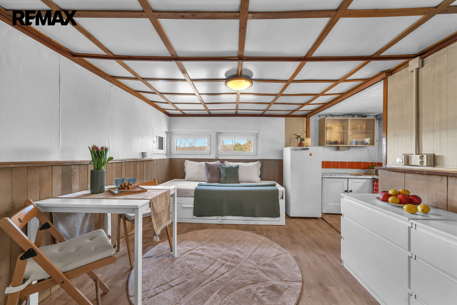 - hlavní obytný prostor s kuchyňským koutem, jídelnou a obývací částí