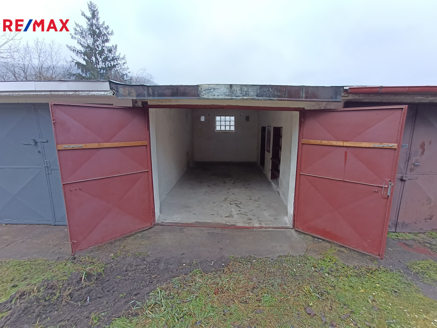 Garáž je v dobrém technickém stavu, má betonovou podlahu, železná dvoukřídlá vrata a suchou střechu. Elektřina není zavedena – ideální tedy pro parkování vozu, motorky nebo bezpečné uložení sezónních věcí.