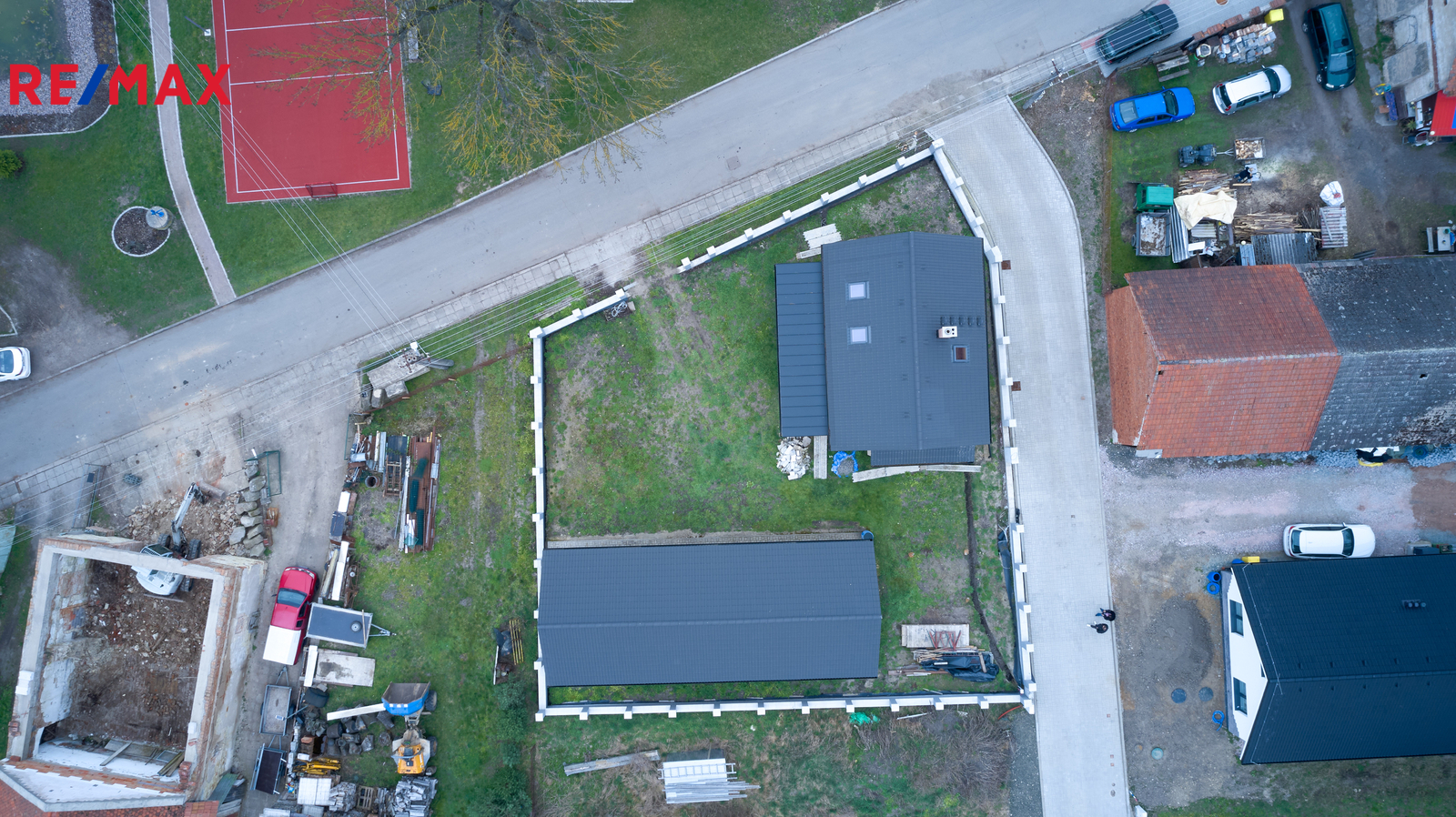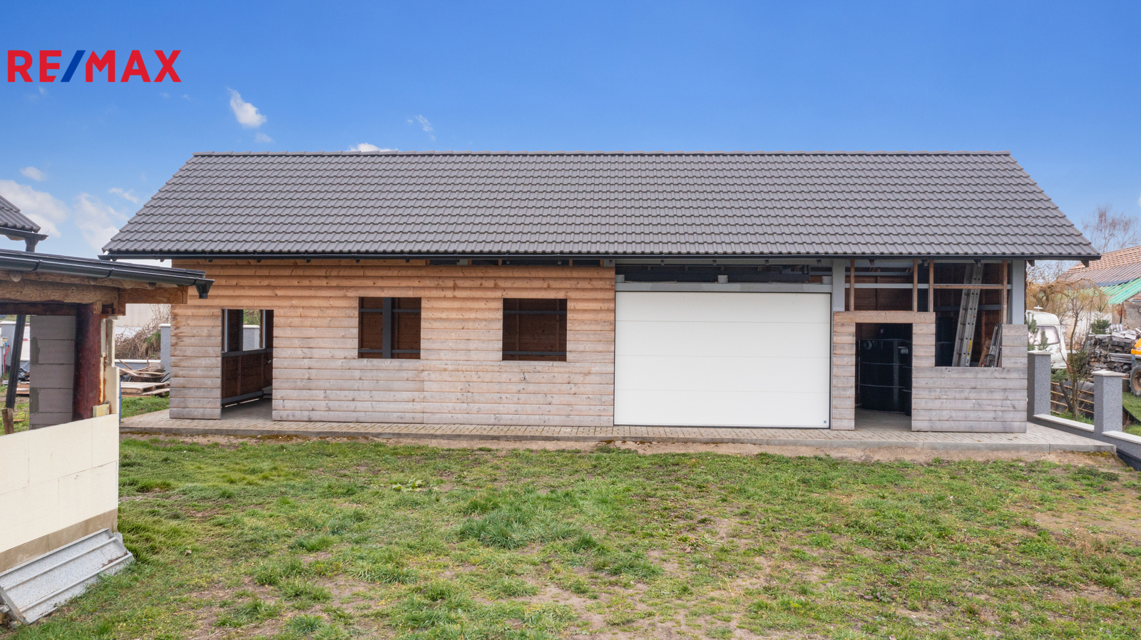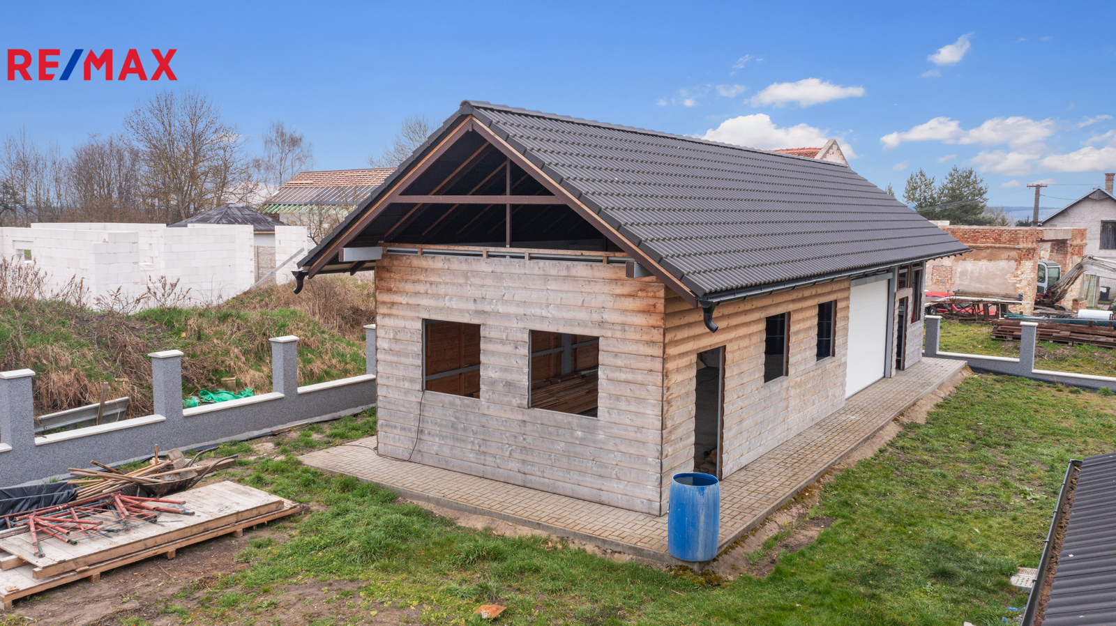 Pozemek je oplocen novým zděným plotem se sloupky, který stačí doplnit o výplň dle vlastního výběru, například dřevěné latě. Velkým benefitem této nemovitosti je prostorná garáž s dílnou a skladem, která je postavena na betonových základových pásech s ocelovou konstrukcí a dřevěným opláštěním. Garáž disponuje velkými elektricky ovládanými vraty a velkými okny, která jsou připravena k osazení. Tento prostor nabízí široké možnosti využití nejen pro parkování, ale také jako truhlářská nebo zámečnická dílna, autoservis, skladové prostory nebo zázemí pro drobné podnikání. Díky velikosti a konstrukci je ideální pro každého, kdo potřebuje kombinovat bydlení s prací nebo svými koníčky.