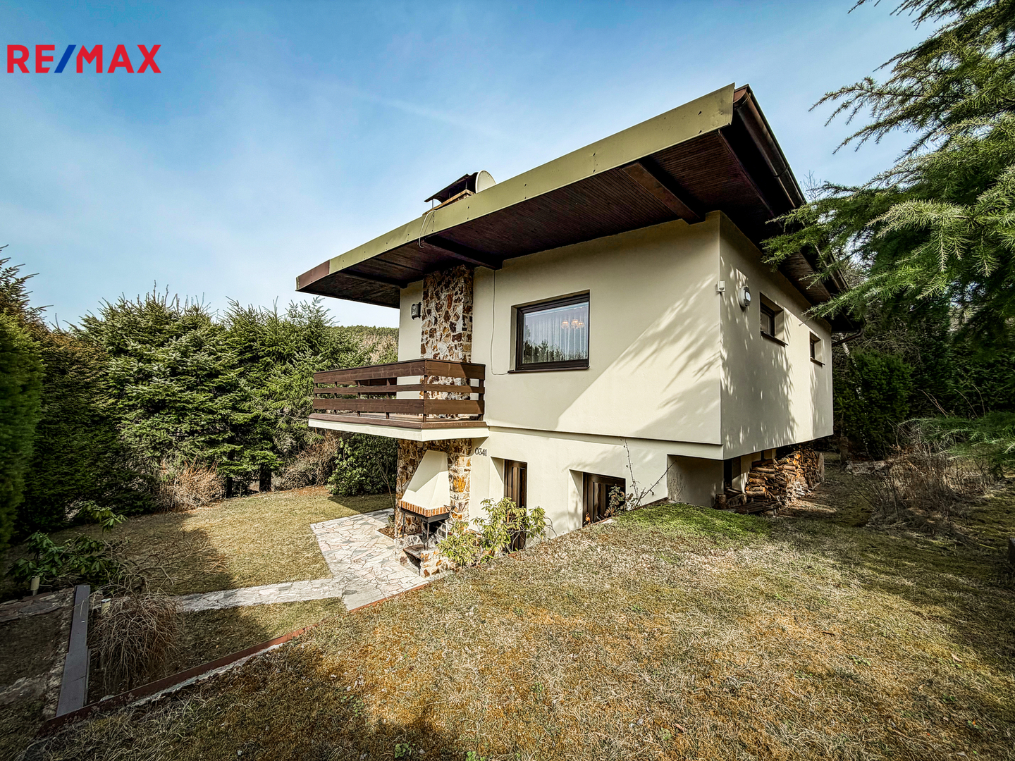 Samotná chata má obytnou plochu 105 m² a její dispozice nabízí komfortní a praktické zázemí pro celoroční užívání. V přízemí se nachází prostorná obytná místnost s krbem a kuchyňskou linkou, koupelna s vanou a WC, a také technická místnost. V patře jsou dva samostatné pokoje, druhé WC a velký krytý balkón s krásným výhledem do okolní zeleně – ideální místo na ranní kávu nebo večerní posezení.