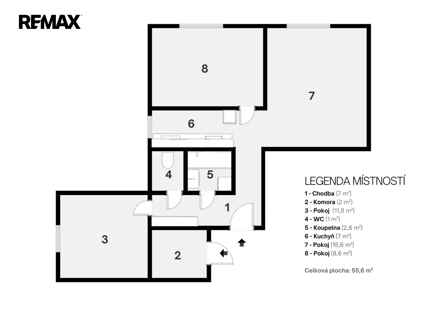 Byt tvoří obývací pokoj o výměře (15,6 m²), kuchyň o velikosti (7 m²) s novým sporákem a lednicí, dále dva samostatné neprůchozí pokoje o výměře (8,6 m² a 11,8 m²), koupelna (2,6 m²) s vanou, umyvadlem a pračkou, samostatné WC (1 m²), předsíň a chodba (7 m²) a také samostatná komora (2 m²) umístěná hned vedle vstupních dveří do bytu. Celková užitná plocha bytu včetně komory činí 55,6 m².