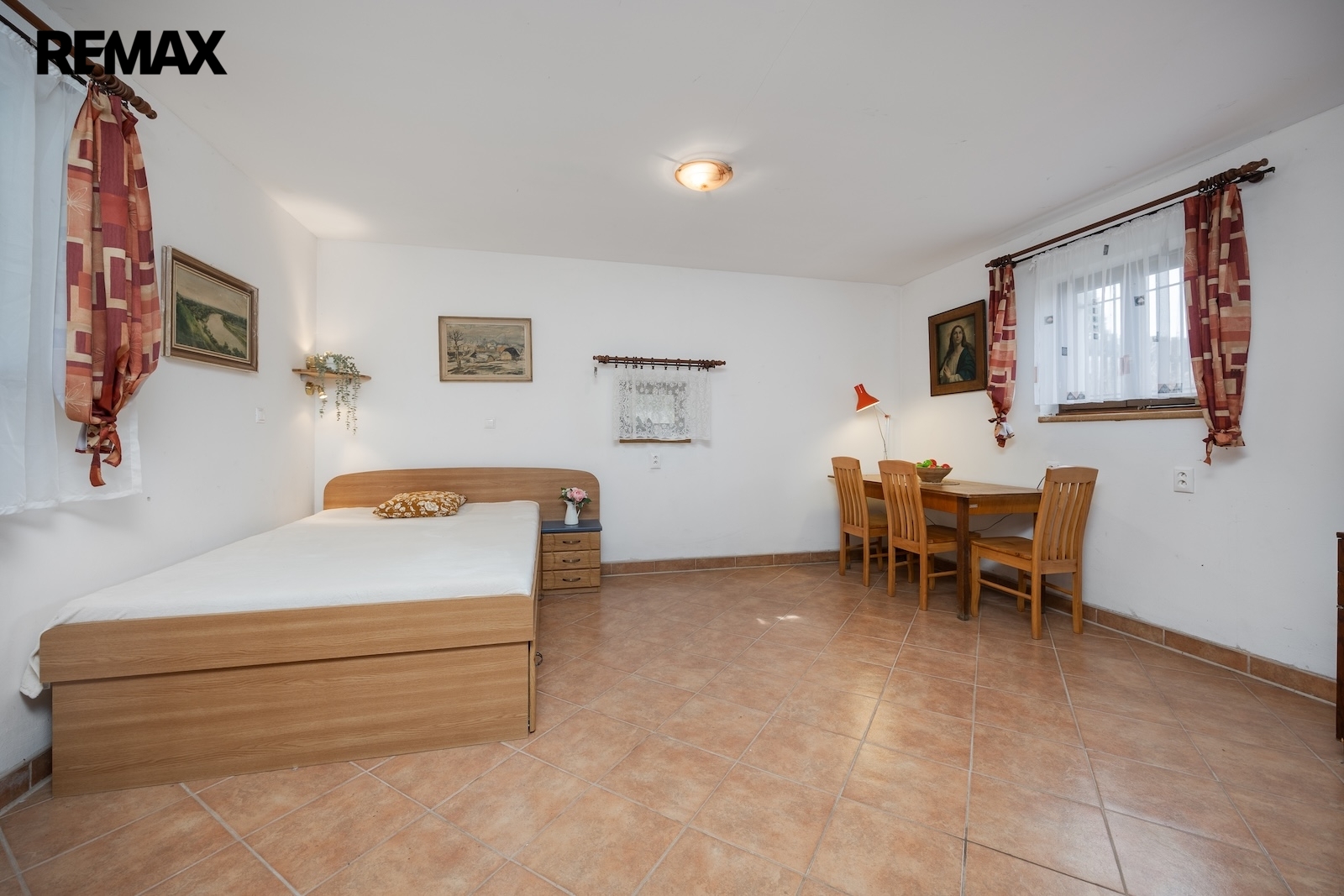 V přízemí se nacházejí dvě prostorné místnosti, které tvoří srdce celé chalupy. Hlavní obytný prostor, tradiční světnice, slouží jako místo pro vaření, stolování i odpočinek. Dominantou této místnosti jsou stylová kachlová kamna, ve kterých je možné nejen topit, ale i vařit nebo péct, což podtrhuje autentickou venkovskou atmosféru. Druhá místnost v přízemí je využívána jako ložnice s pracovním koutem, vytápěná klasickými kamny, a nabízí příjemné zázemí pro spaní i klidnou práci.