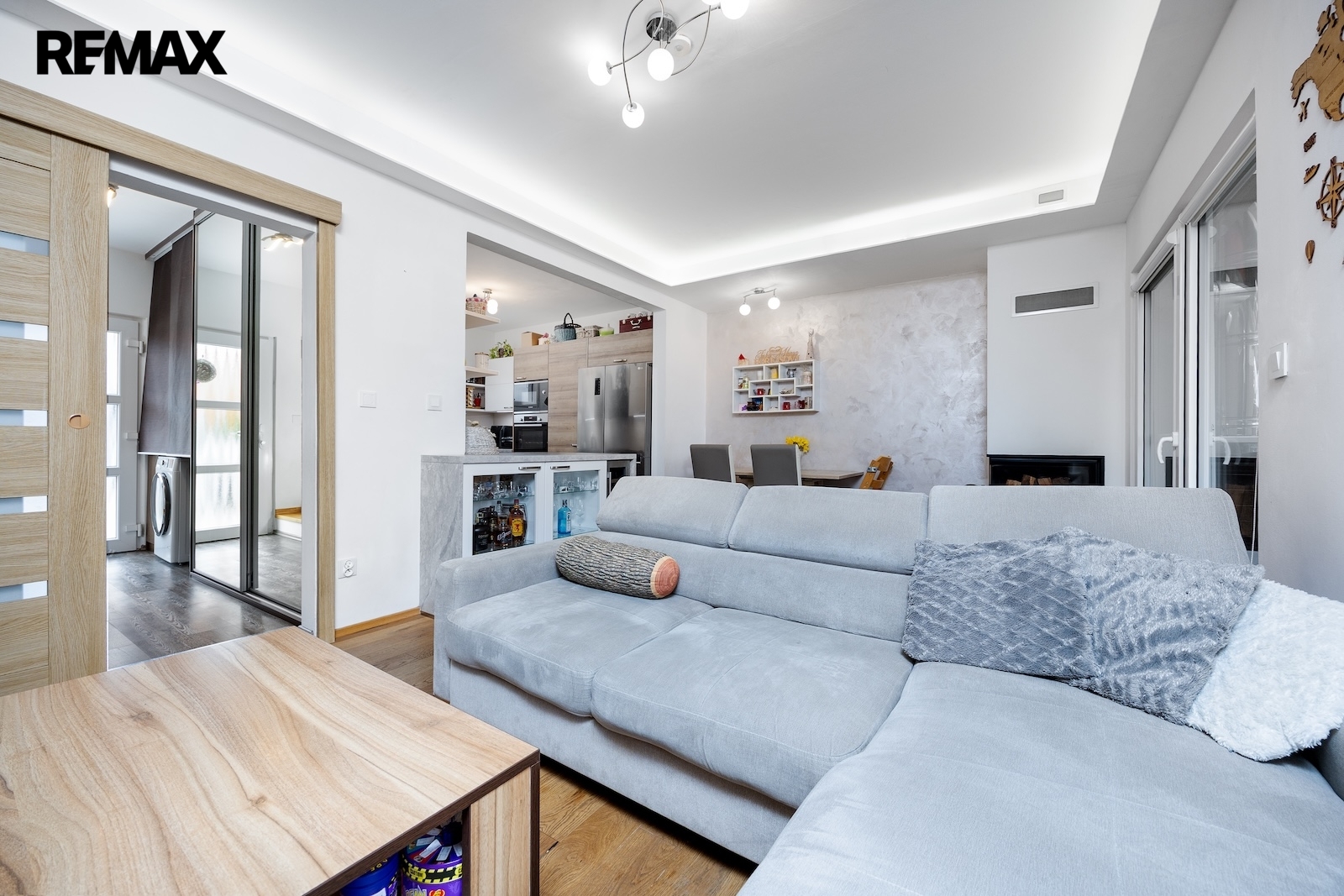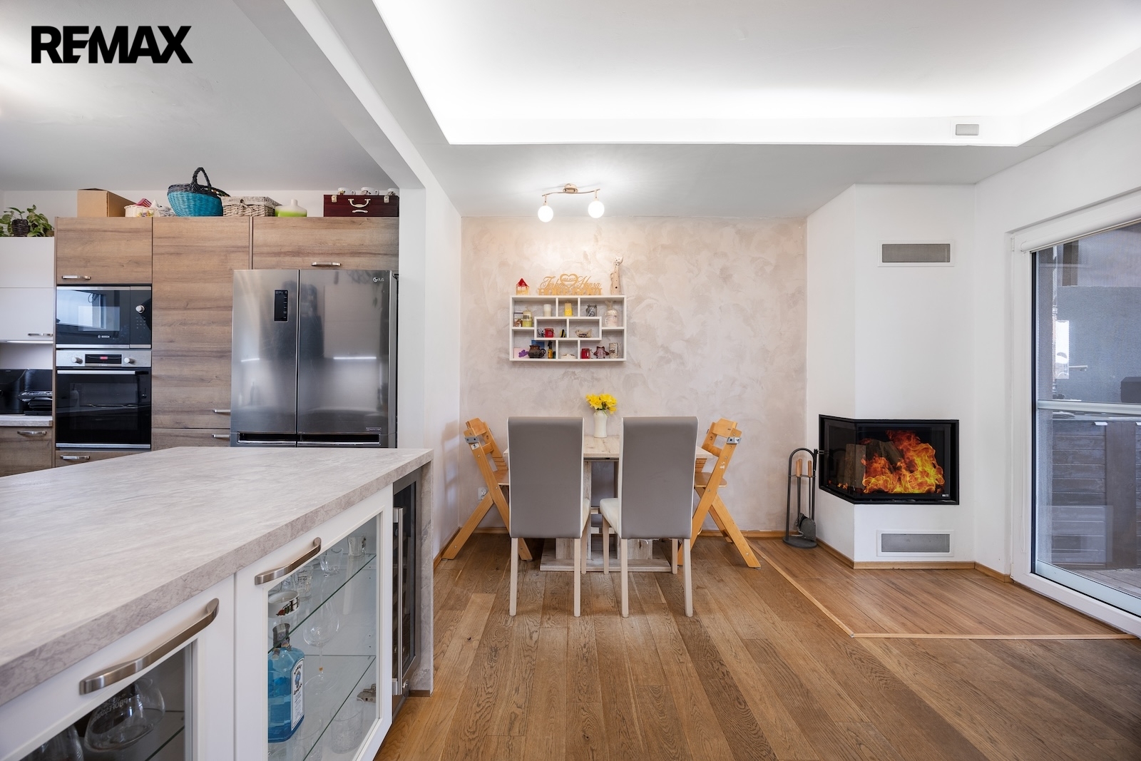 Vytápění: Podlahové topné fólie v celém domě (vyjma WC a galerie), které zajišťují maximální tepelný komfort a součástí i krbová vložka.
