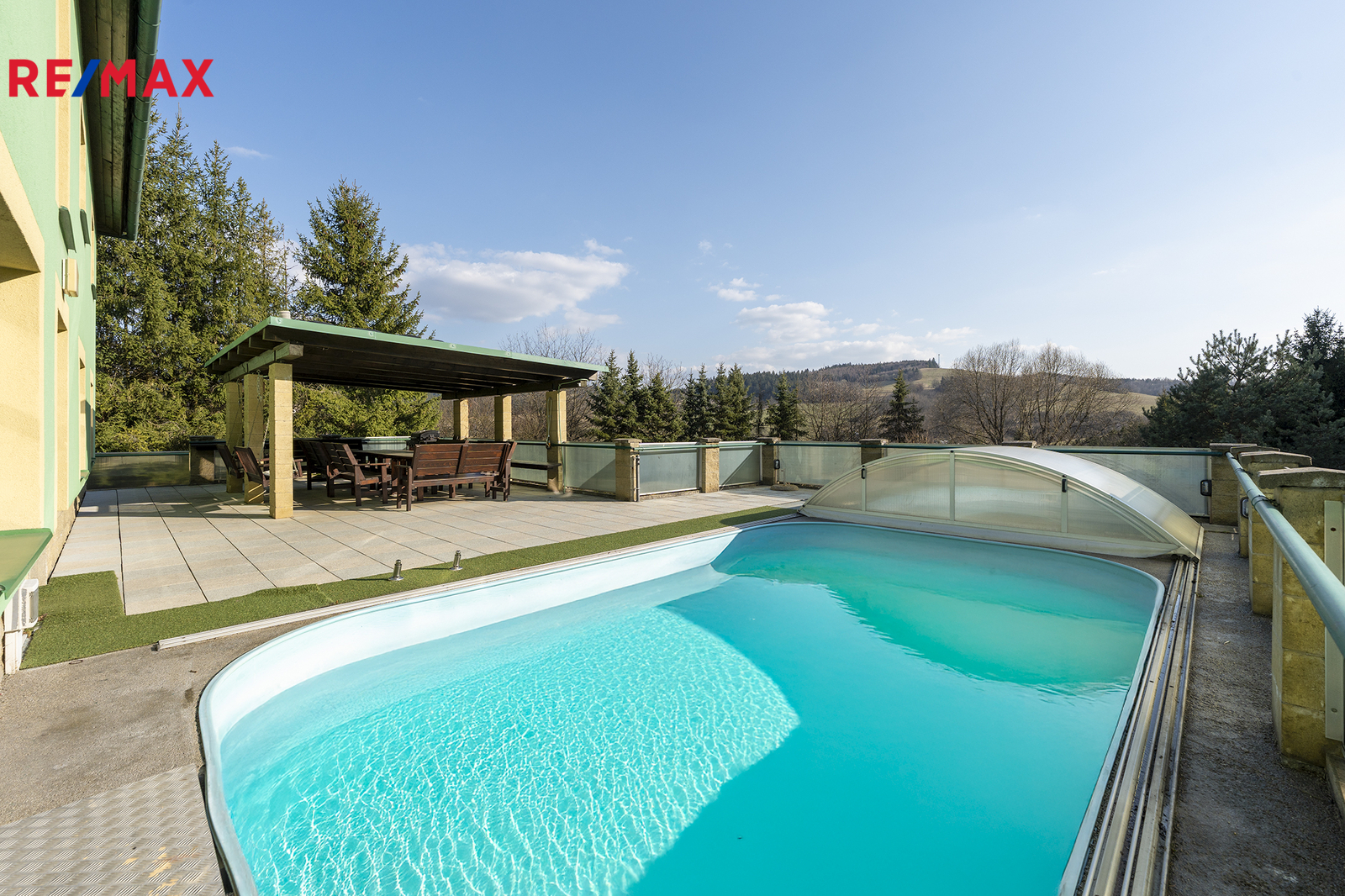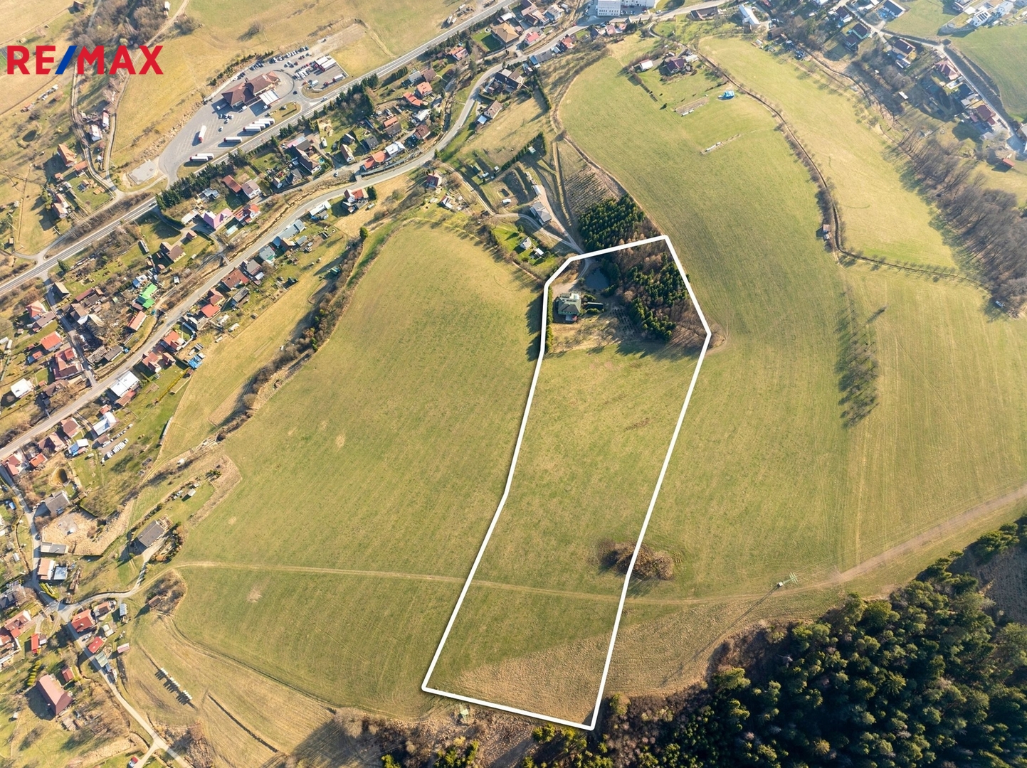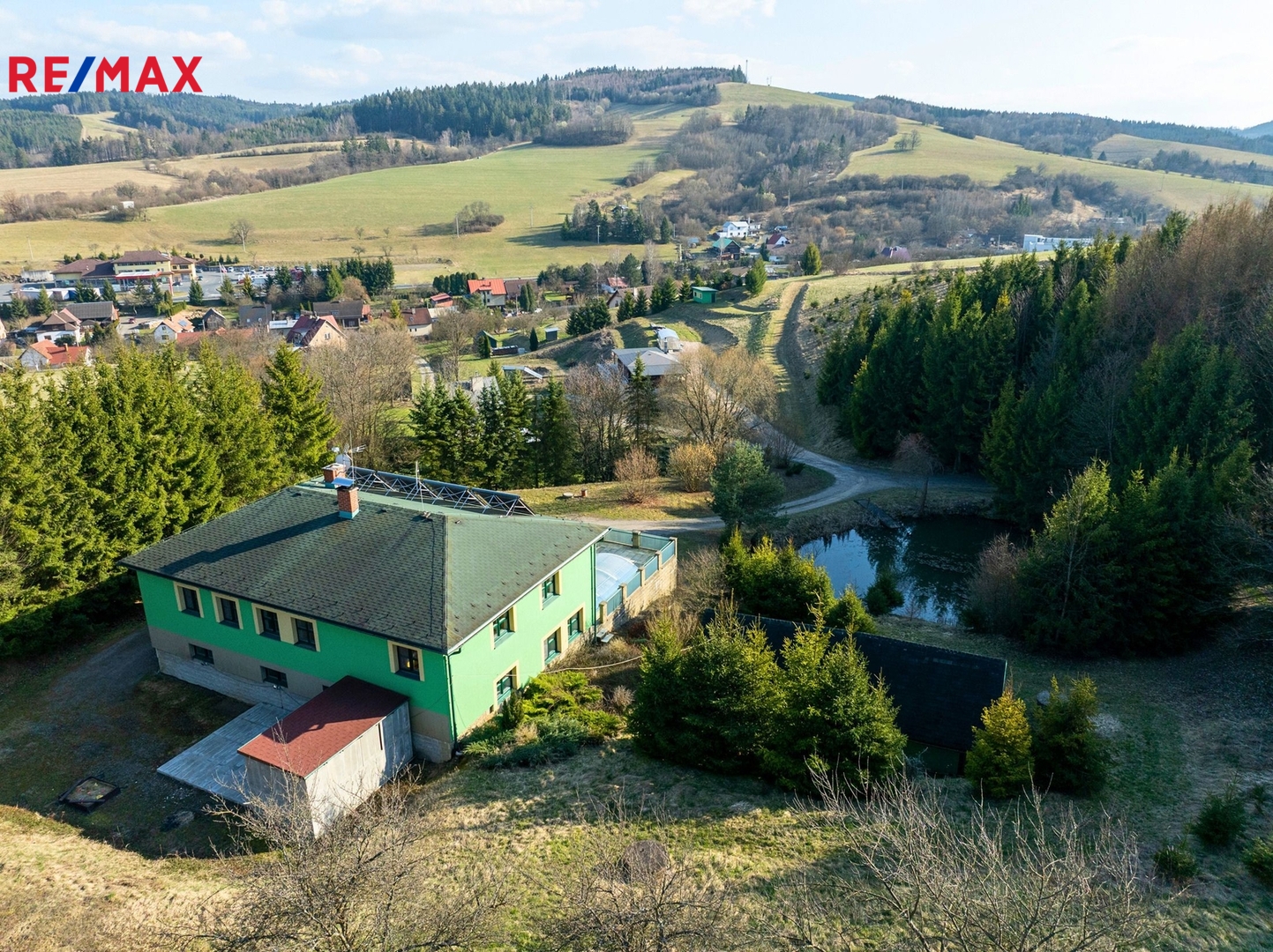 Součástí nemovitosti je také dvojgaráž, kůlna, okrasné jezírko a rozsáhlý pozemek, který nabízí maximální soukromí a klid. Přístup k domu je zajištěn po zpevněné komunikaci až k nemovitosti, kde se nachází velkorysý manipulační prostor s možností parkování pro více vozidel.
