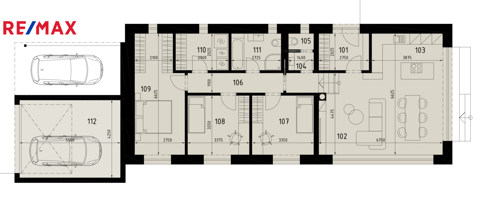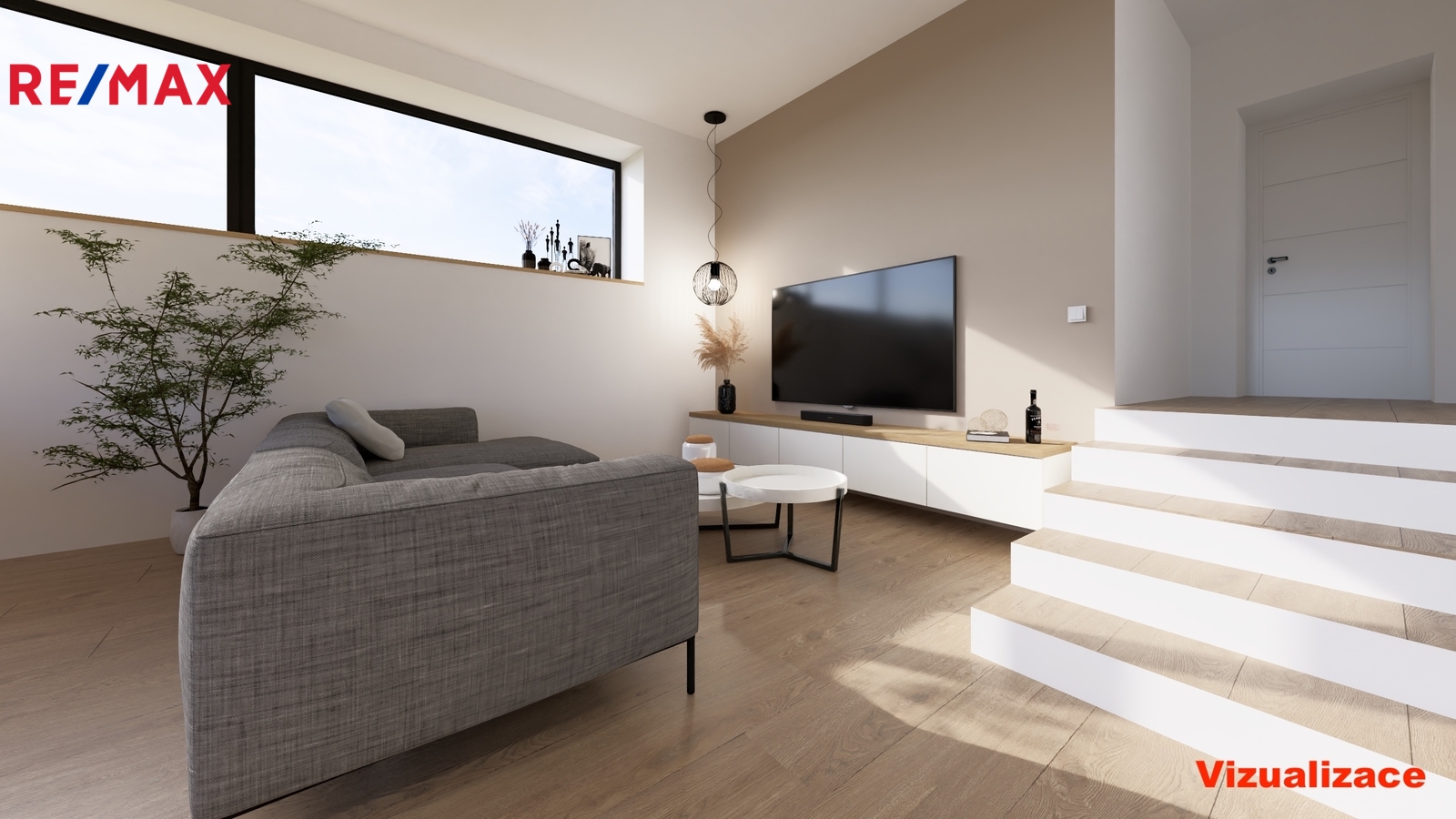 Dominantou je prostorný obývací pokoj s kuchyňským koutem, dále tři samostatné pokoje, koupelna, samostatné WC a technická místnost.