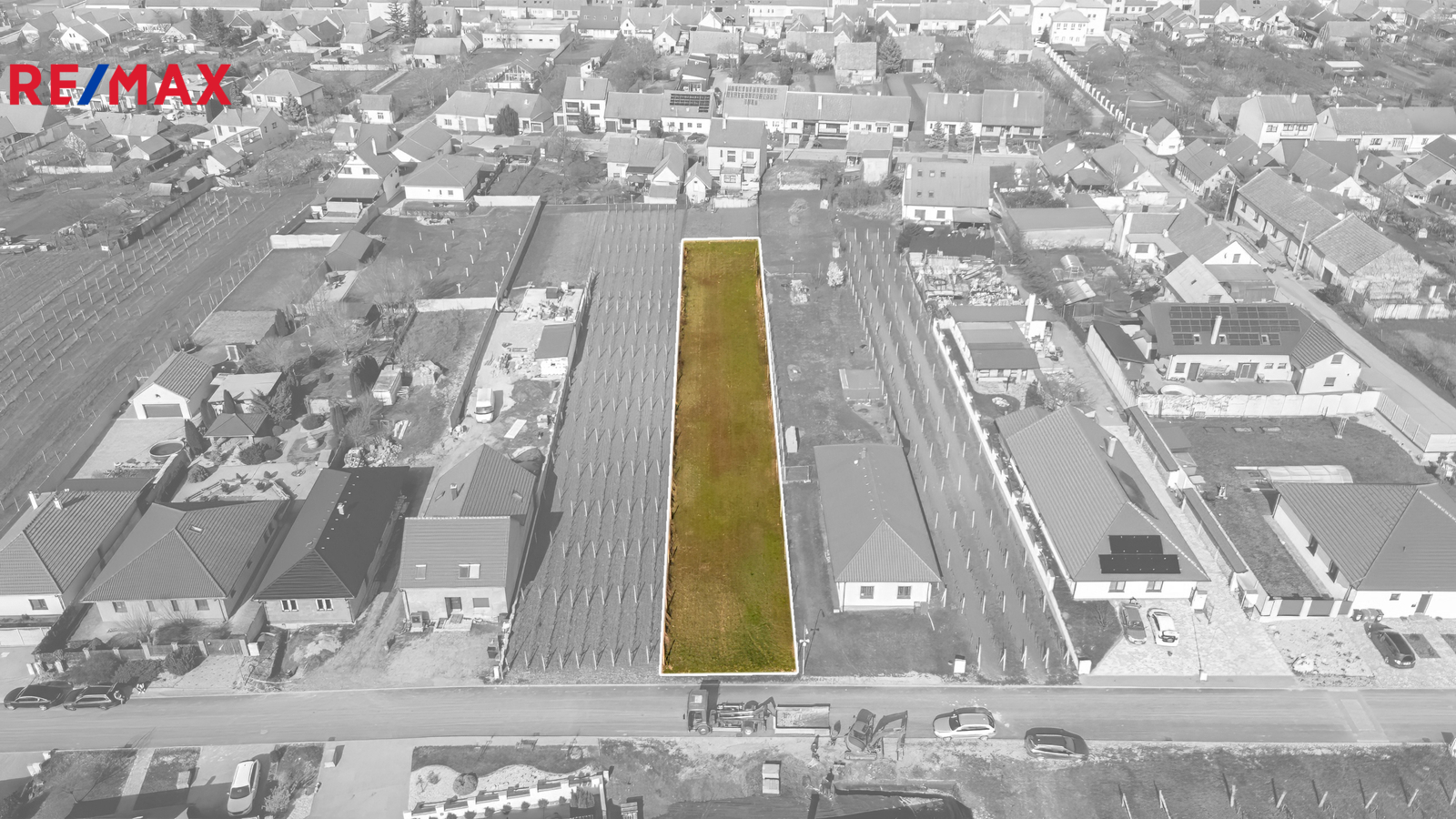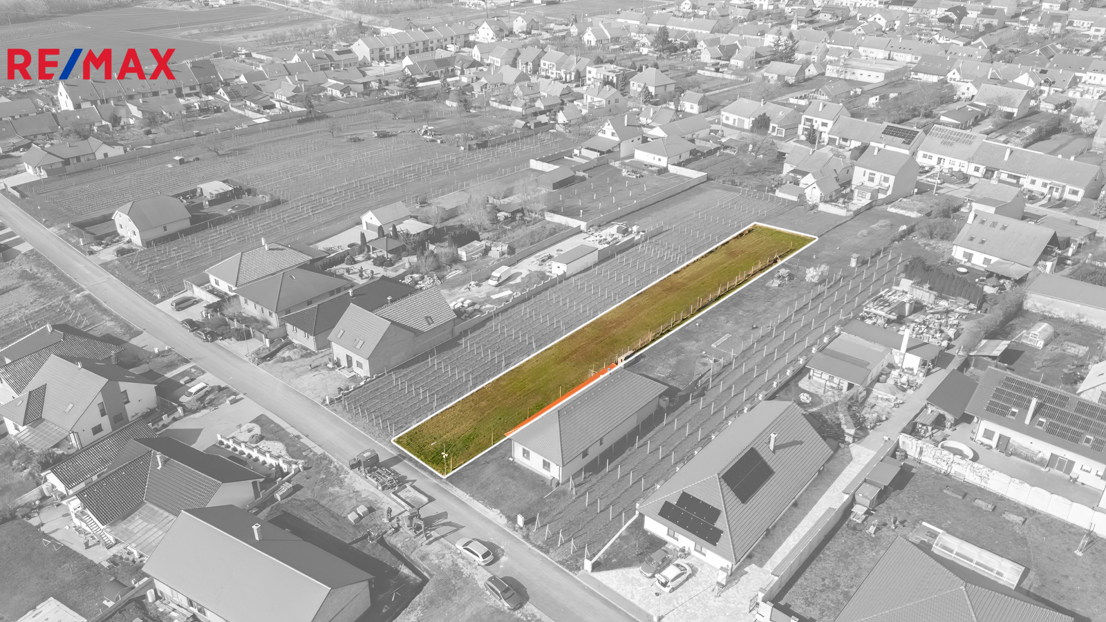 Pozemek má uliční šíři cca 12,4 m a hloubku cca 101 m. Je rovinatý a nachází se v lokalitě, kde převažují novostavby a další pozemky určené k výstavbě. Z jedné strany již stojí rodinný dům, z druhé je vinohrad.