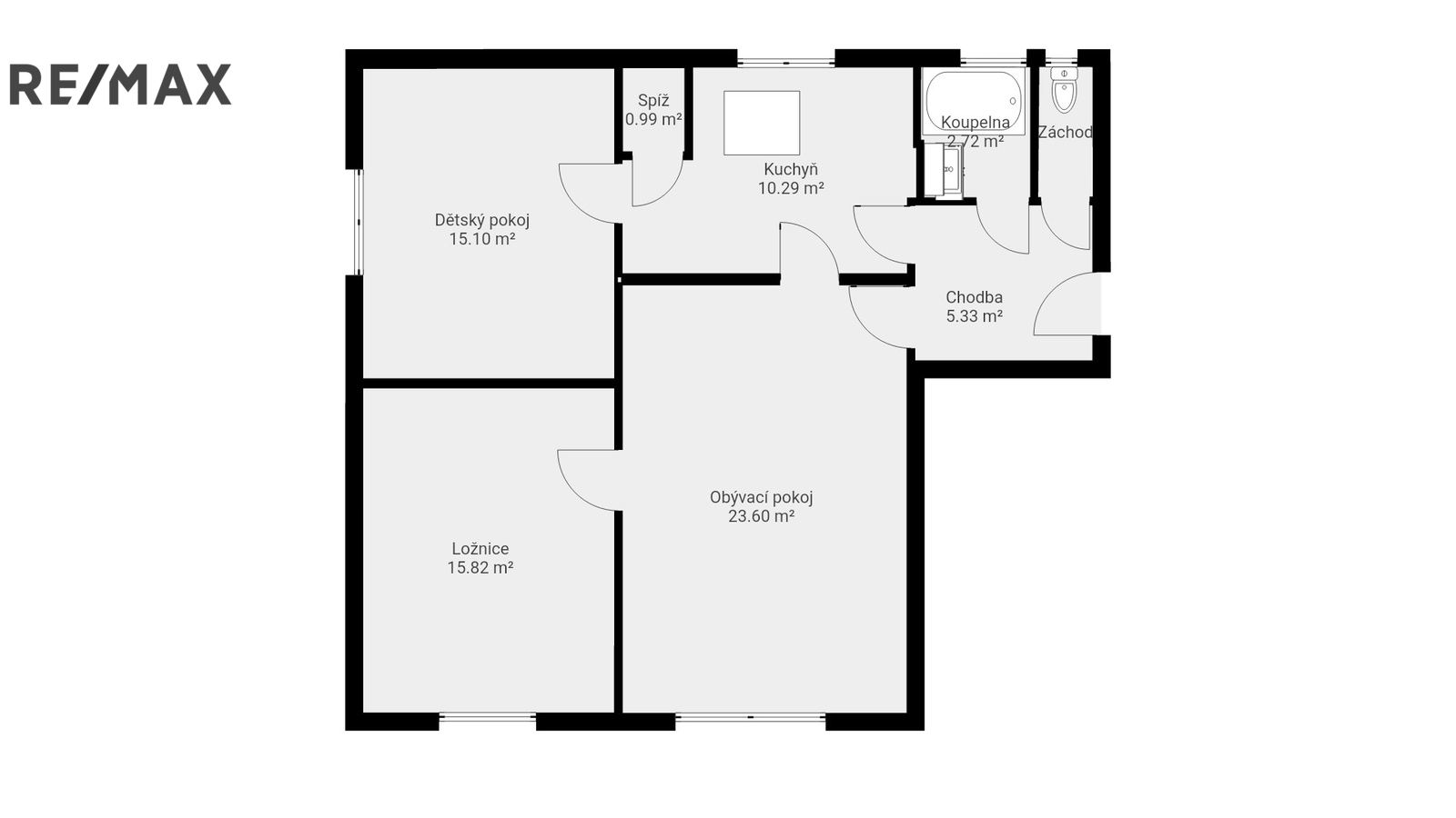 Současná dispozice bytu nabízí kuchyni o výměře 10 m², světlý obývací pokoj 22,8 m², dva samostatné pokoje o velikosti 14,8 m² a 14,7 m², dále spíž 1,4 m², vstupní chodbu 5,9 m², samostatné WC 1,5 m² a prostornou koupelnu s vanou 8,8 m².