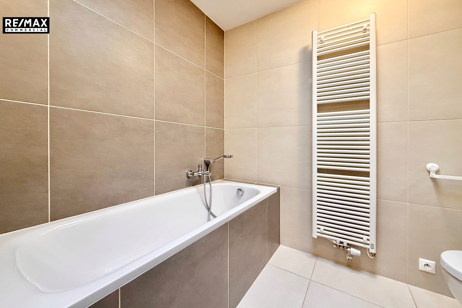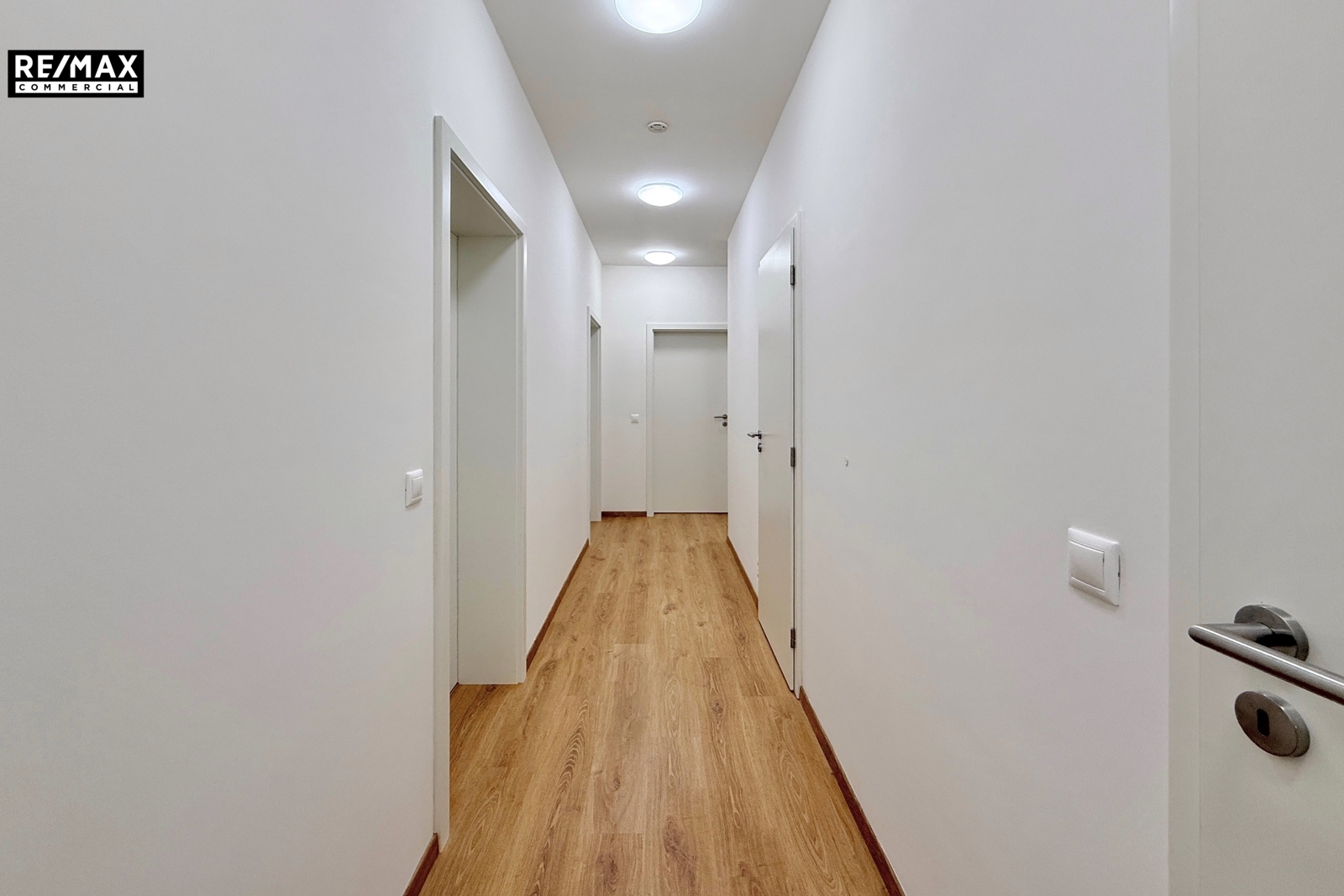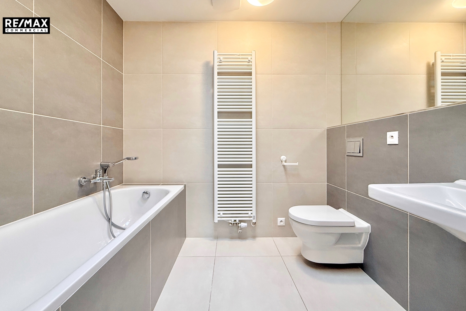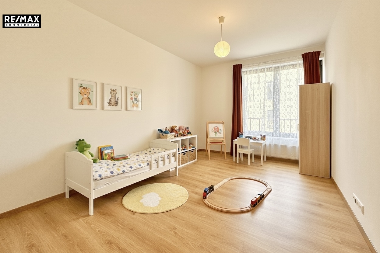 V bytě se dále nachází dvě samostatné ložnice – hlavní ložnice má vlastní koupelnu se sprchovým koutem, což dodává bytu ještě větší komfort. Na chodbě je prostor pro pračku a sušičku. Podlahy v obytných místnostech jsou pokryty plovoucí podlahou v dekoru dřeva, která dotváří teplo domova, v koupelnách a na chodbě je elegantní dlažba. K bytu náleží také velký sklep a garážové stání v 1. PP domu.