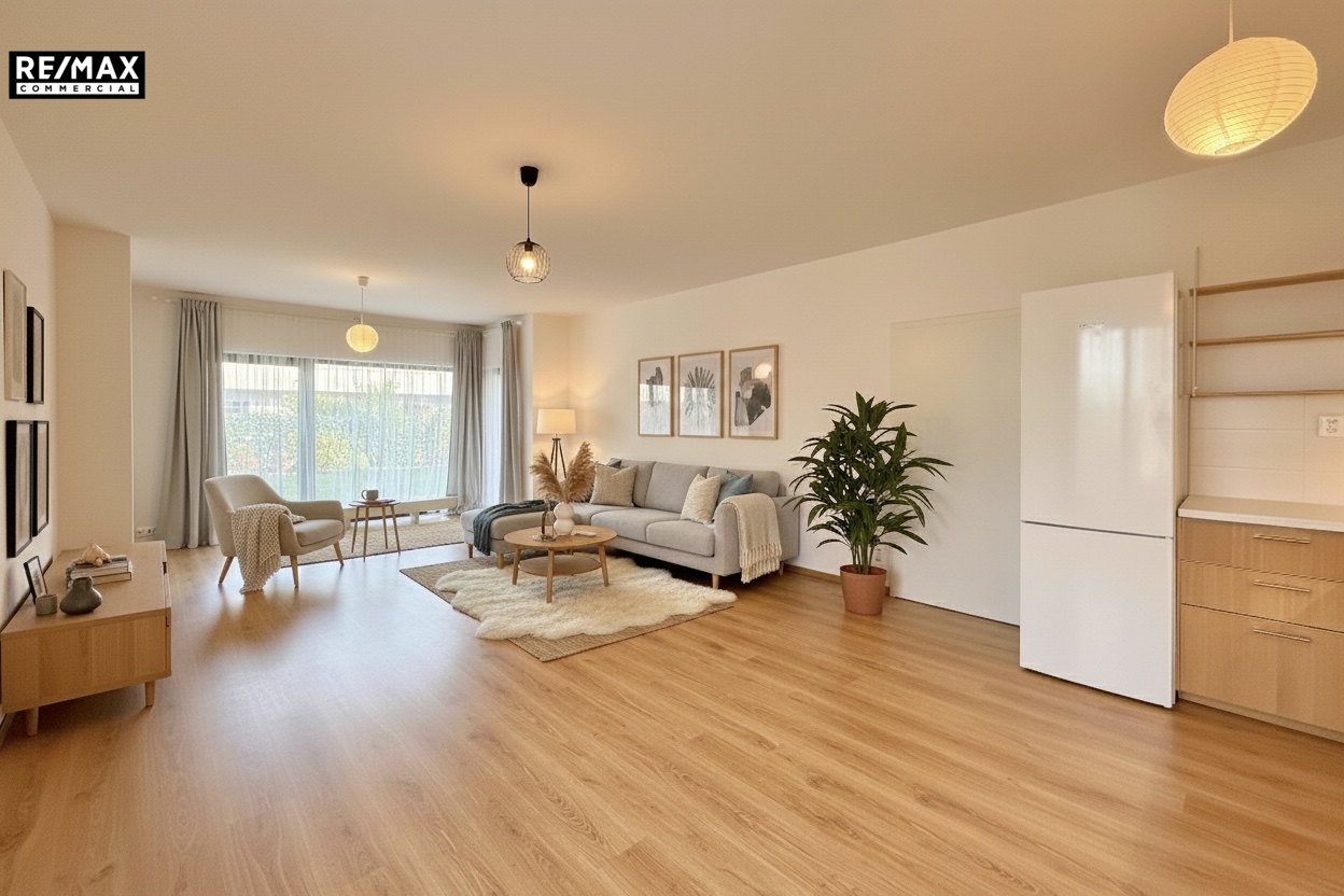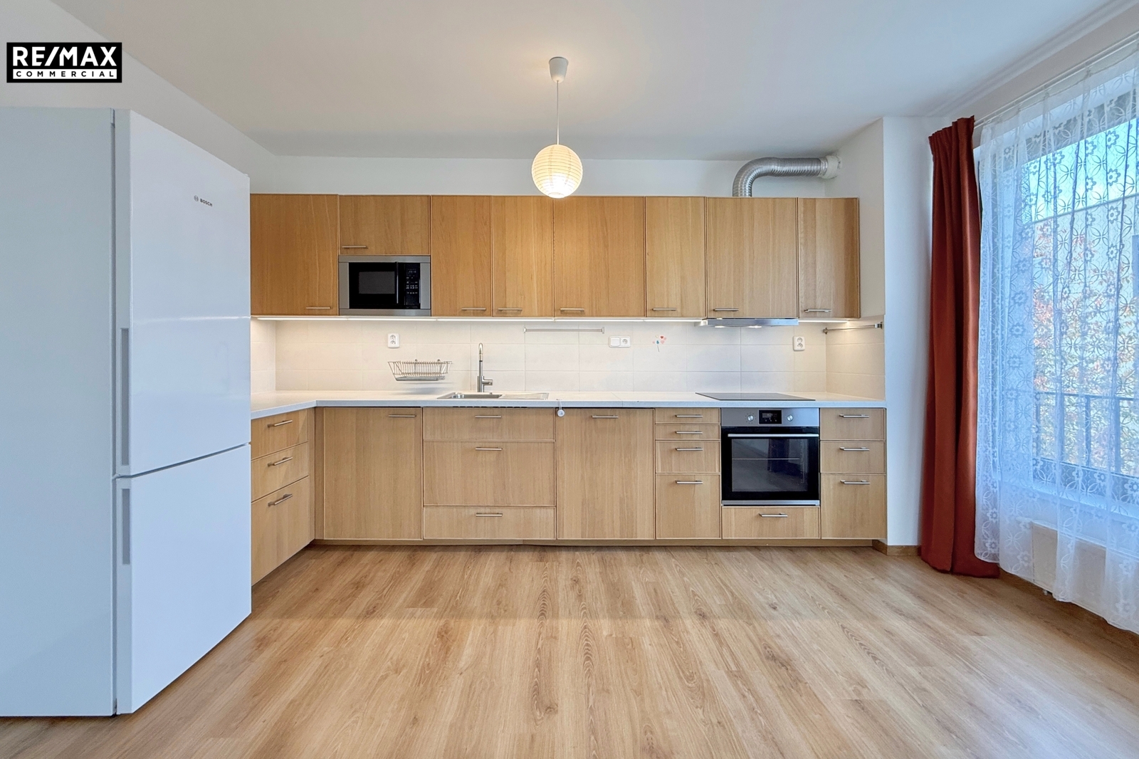 Srdcem bytu je prostorný obývací pokoj s kuchyňským koutem o výměře téměř 40 m². Kuchyňská linka o délce přes čtyři metry nabízí dostatek prostoru pro vaření i ukládání věcí, a je vybavena kvalitními spotřebiči značky Electrolux – indukční varnou deskou, digestoří, lednicí s mrazákem, mikrovlnnou troubou i myčkou. Okno v kuchyni poskytuje příjemný výhled do zeleně sousedních zahrad, takže i každodenní vaření se stává radostí.