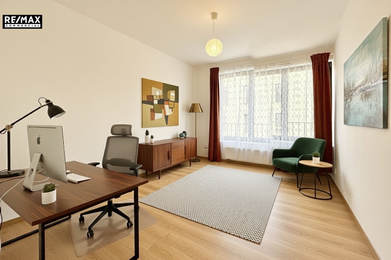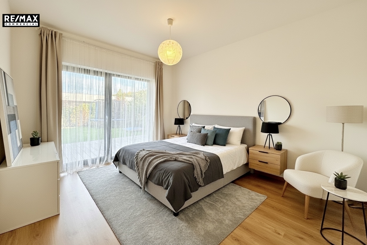 Součástí bytu je soukromá, pečlivě udržovaná zahrada s velkorysou terasou, která přímo vybízí k posezení s kávou, grilování s přáteli nebo odpočinku po náročném dni. Obývací pokoj i obě ložnice mají vlastní vstup na terasu a do zahrady. Dominantou bytu jsou velkoformátová francouzská okna, díky nimž je celý prostor krásně prosvětlený a působí útulně a vzdušně. Za vstupem Vás přivítá prostorná chodba s místem pro šatní skříň, naproti které se nachází pracovna.. Po pravé straně najdete koupelnu s vanou.