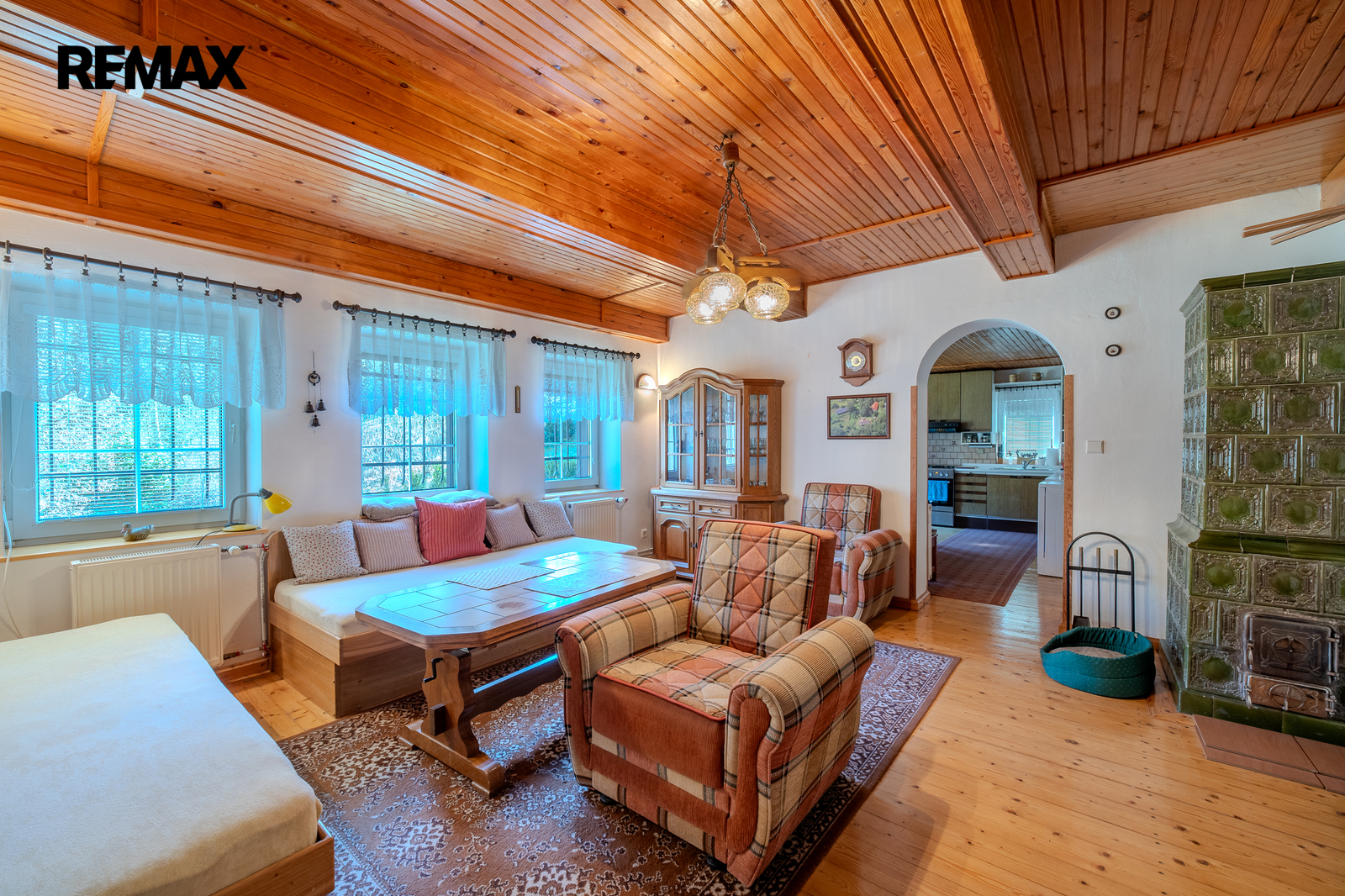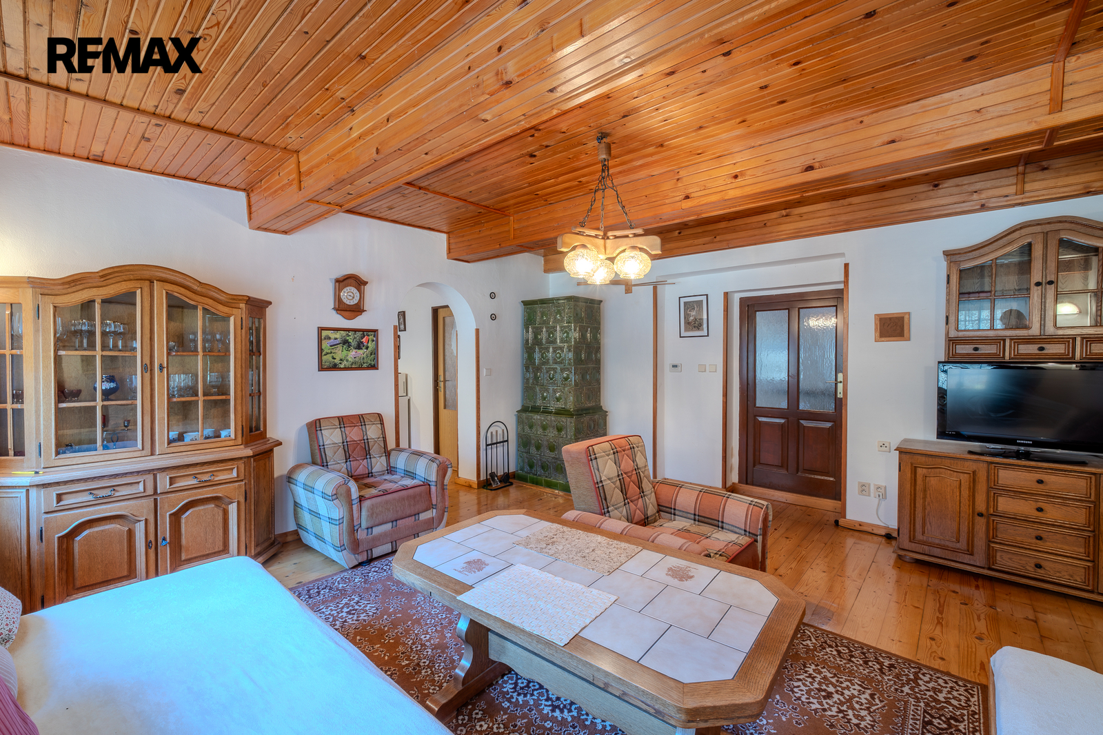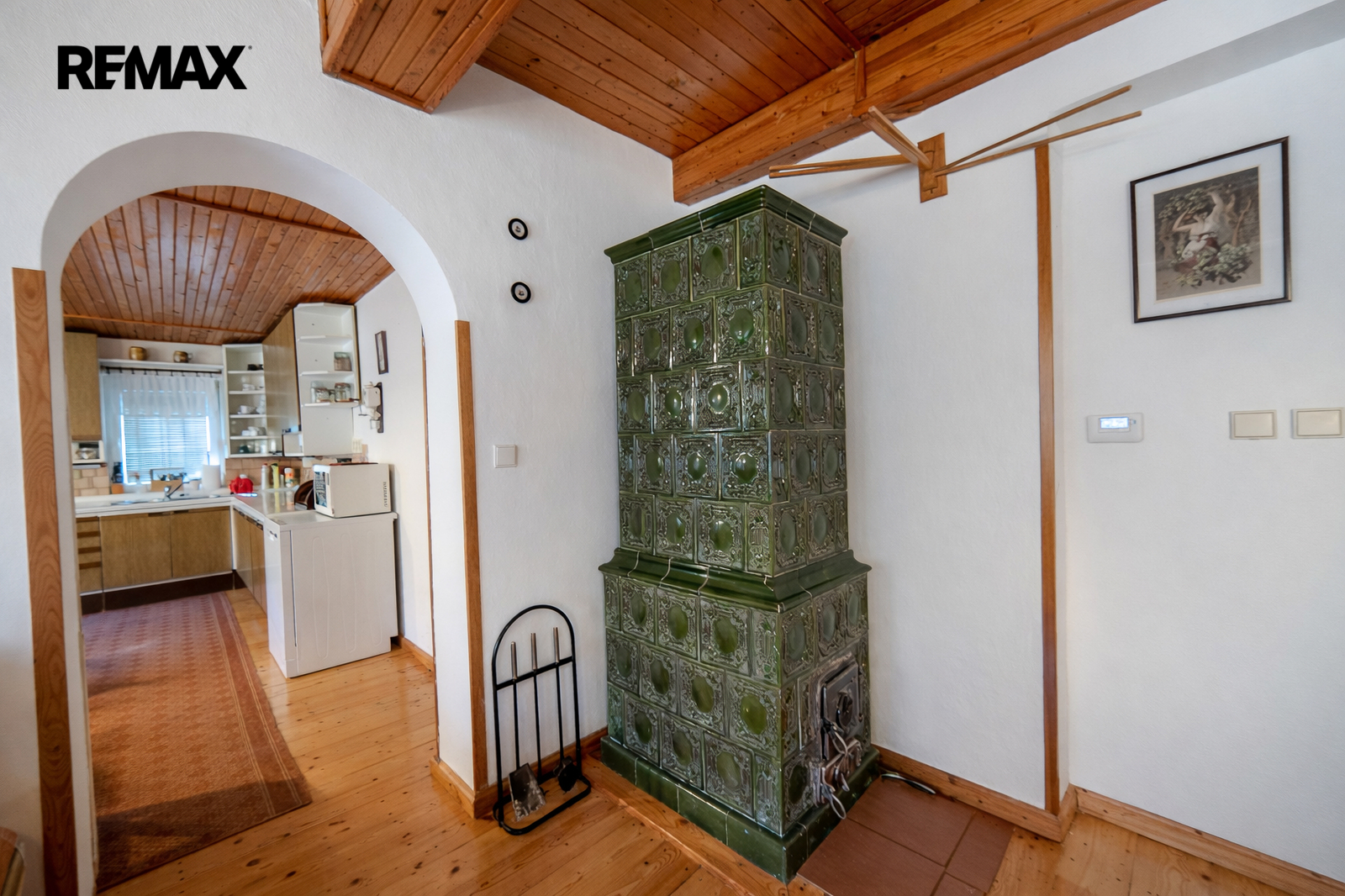 Dominantou interiéru jsou kachlová kamna, která dodávají prostoru jedinečnou atmosféru domova.
