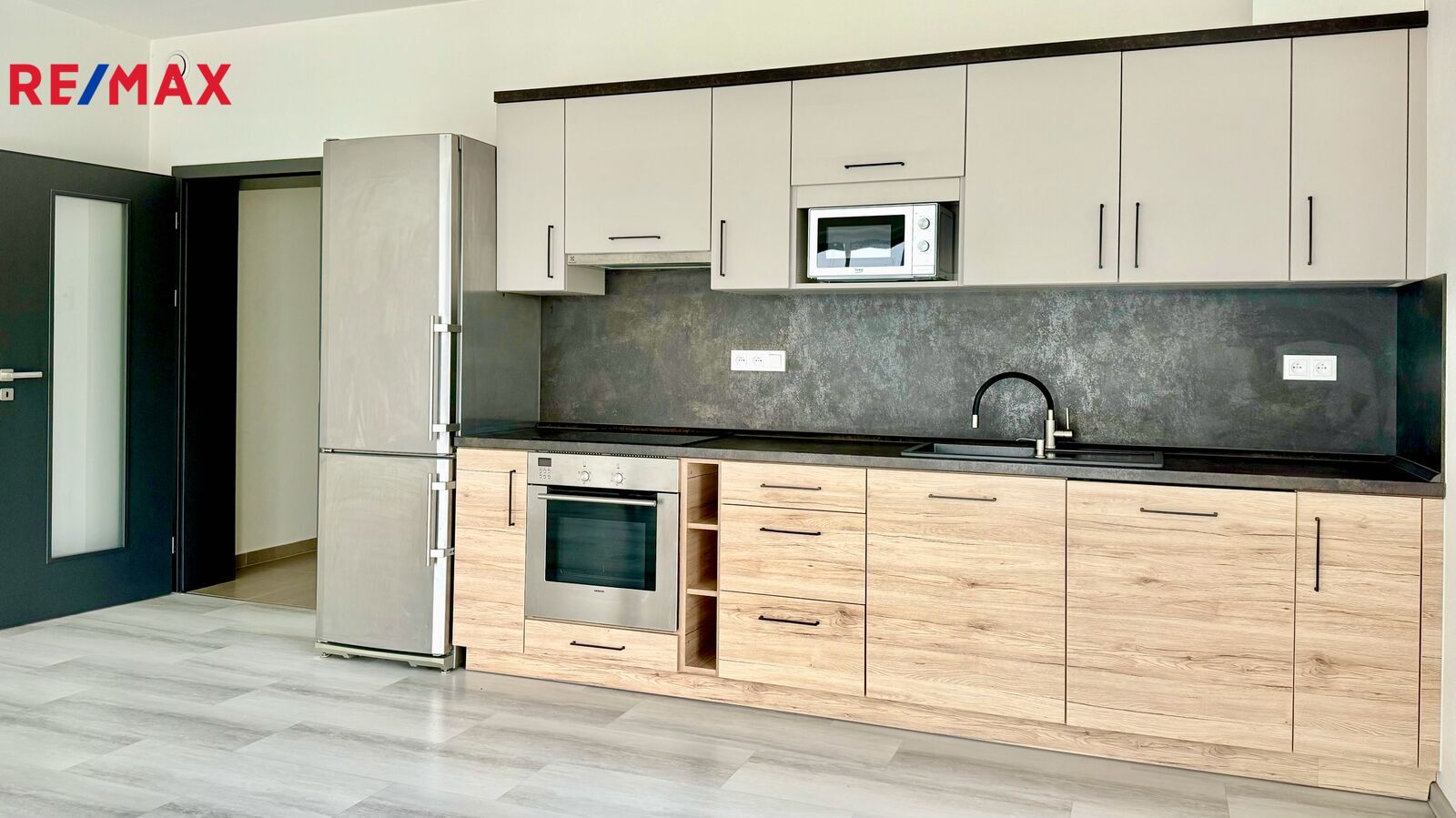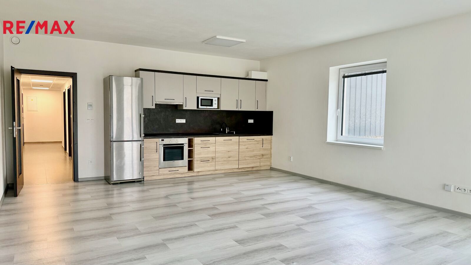 V bytě je kuchyňská linka včetně spotřebičů (odsavač par, sklokeramická deska, trouba, myčka, lednice)