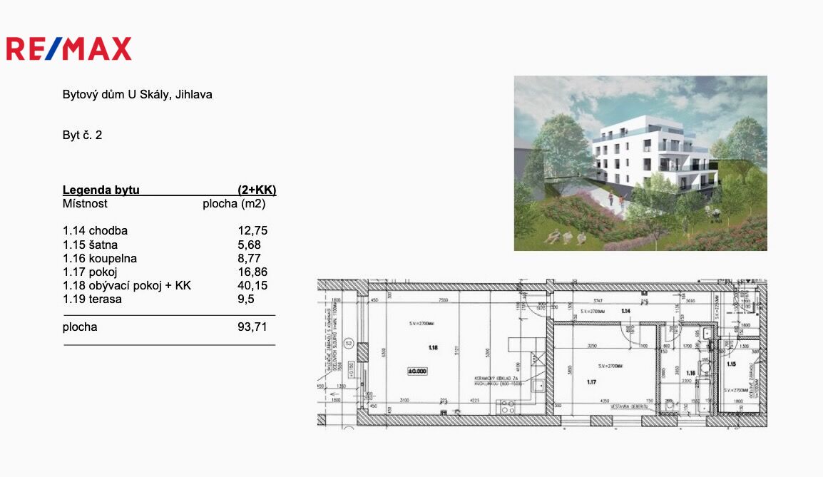 Podlahová plocha bytu 84,21 m2 + sklep 2,79 m2 + terasa 9,5 m2.