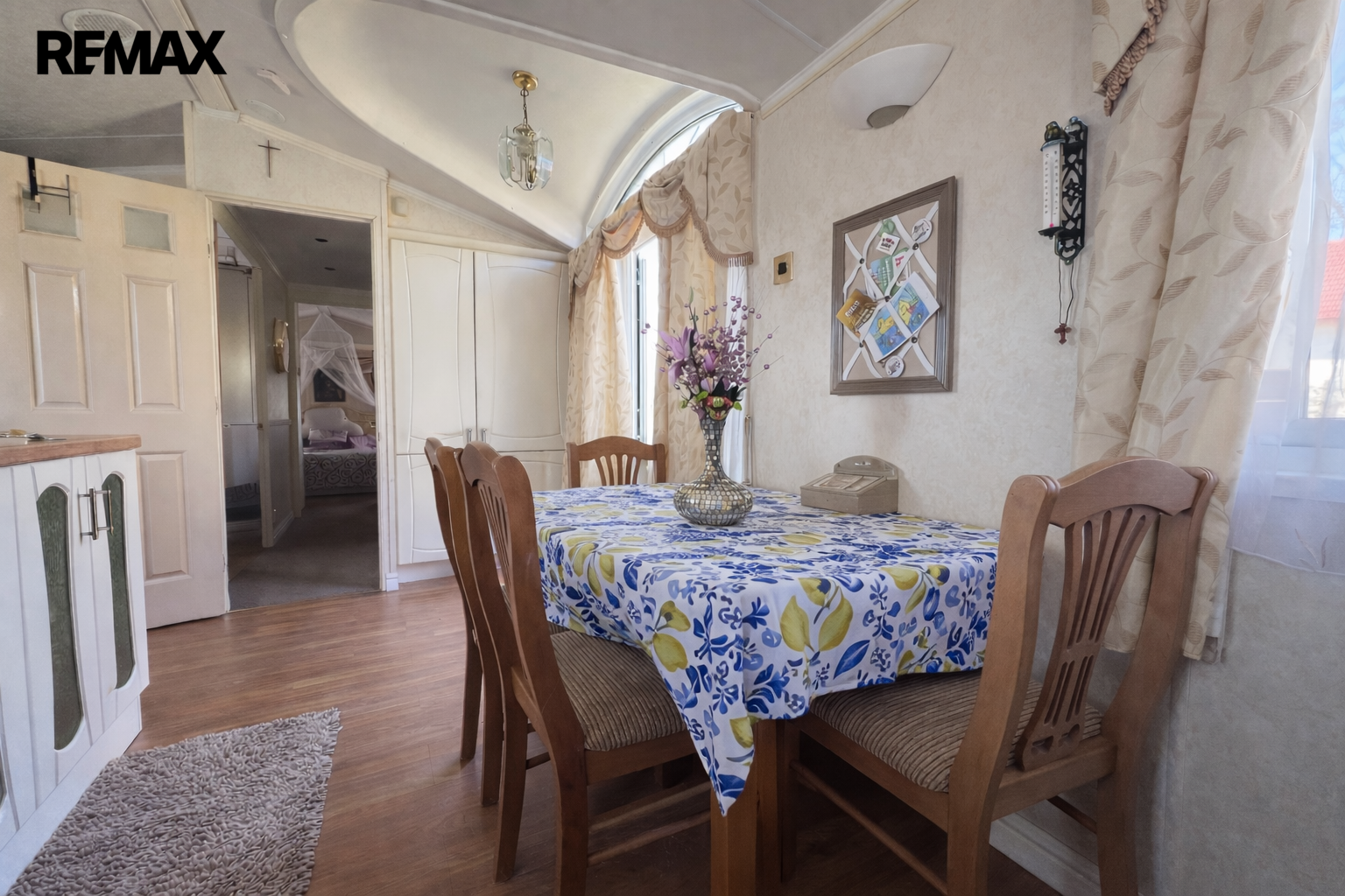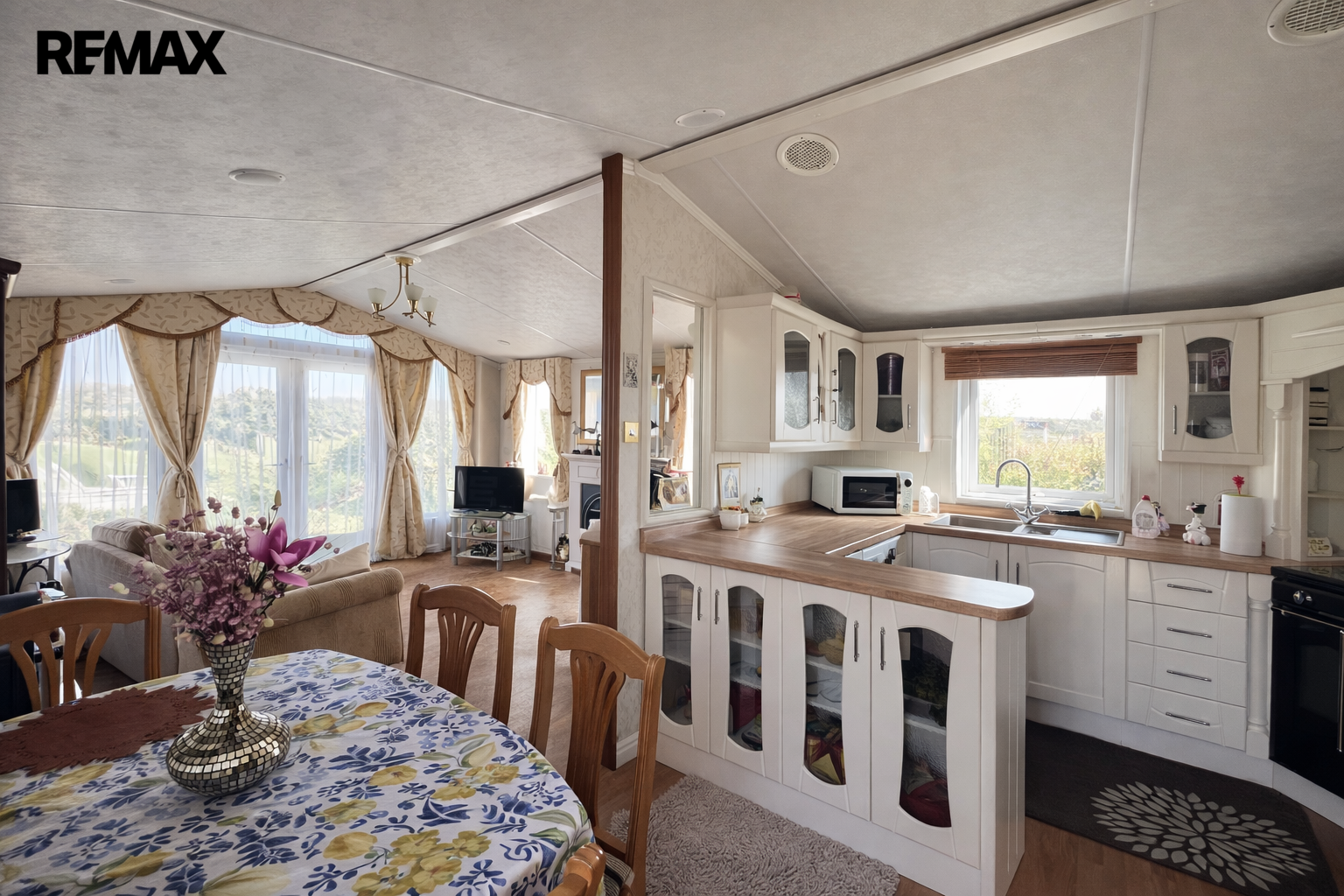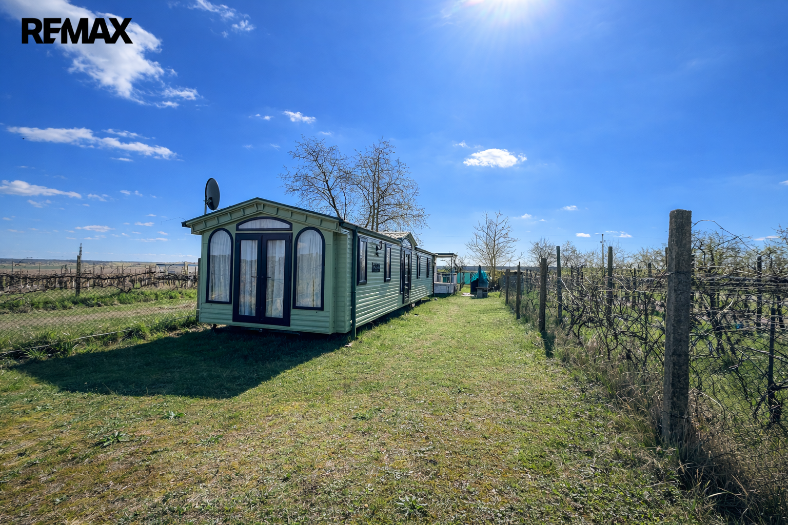 Součástí prodeje je obytný mobilheim značky Willerby Holiday Homes, model The Vogue o rozměrech 14 × 4 metry, přibližně 6 let starý. Poskytuje komfortní zázemí pro rekreační pobyt a je připraven k okamžitému užívání.