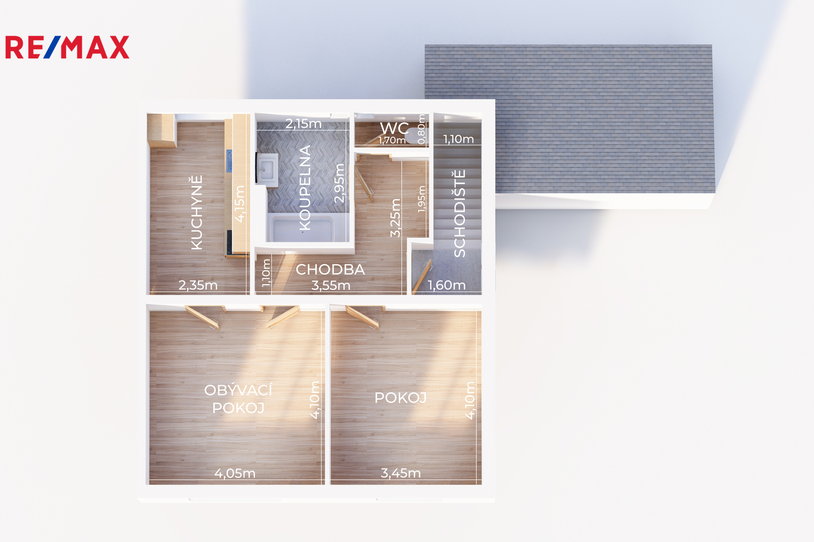 Do bytu se vstupuje z přízemí, kde je zádveří, chodba a dvě komory, které poslouží jako praktické sklady nebo úložné prostory. Odtud vede schodiště do hlavní obytné části, která se nachází v patře. V obytném podlaží najdete kuchyni (10 m²), obývací pokoj (17 m²), ložnici (15 m²), koupelnu s vanou (5,8 m²) a samostatné WC. Součástí je také prostorná předsíň (7,6 m²) a chodba. Nad vstupní částí do bytu se nachází půdní prostor o velikosti 14 m², který je ve velmi dobrém stavu a nabízí další možnosti využití – ať už jako úložný prostor, nebo třeba k vestavbě.
