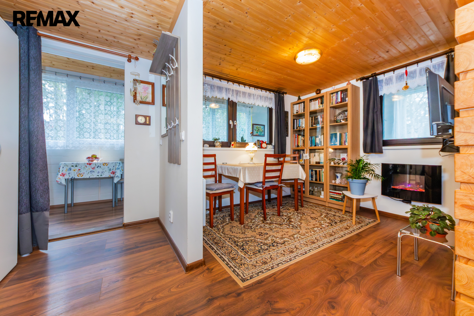Chata byla postavená na klíč specializovanou firmou v roce 2020. Dispozičně je řešena velmi prakticky - vstupní předsíň plynule navazuje na verandu, která byla stavebně upravena (zasklena a zastřešena) a plnohodnotně začleněna do obytného prostoru. Dále vstupujeme do útulného obývacího pokoje, který je prakticky propojený s kuchyňským koutem, na který navazuje koupelna se sprchovým koutem a toaletou. Po točitých schodech se dostaneme do patra, kde jsou situovány dvě ložnice.