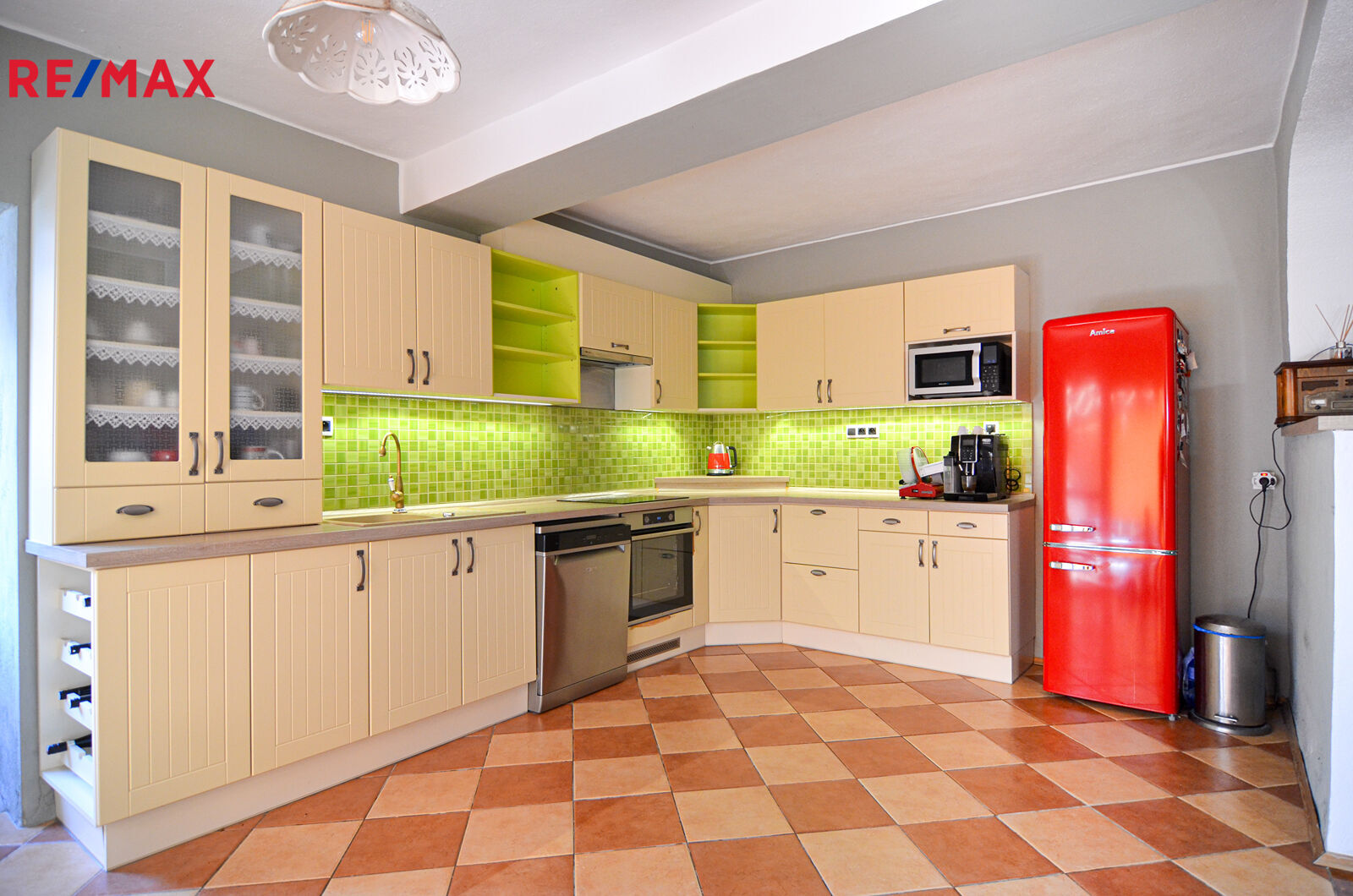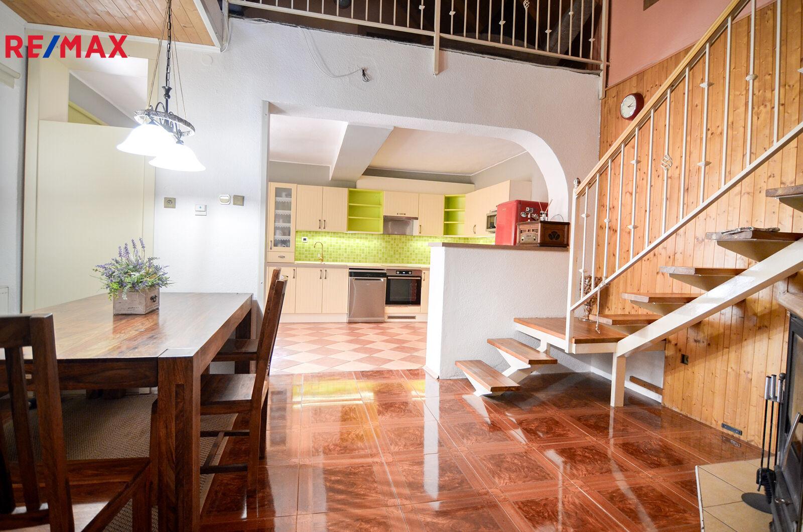 Na druhou stranu od jídelny je kuchyně, což vytváří příjemné prostředí pro rodinné chvíle i společenská setkání.