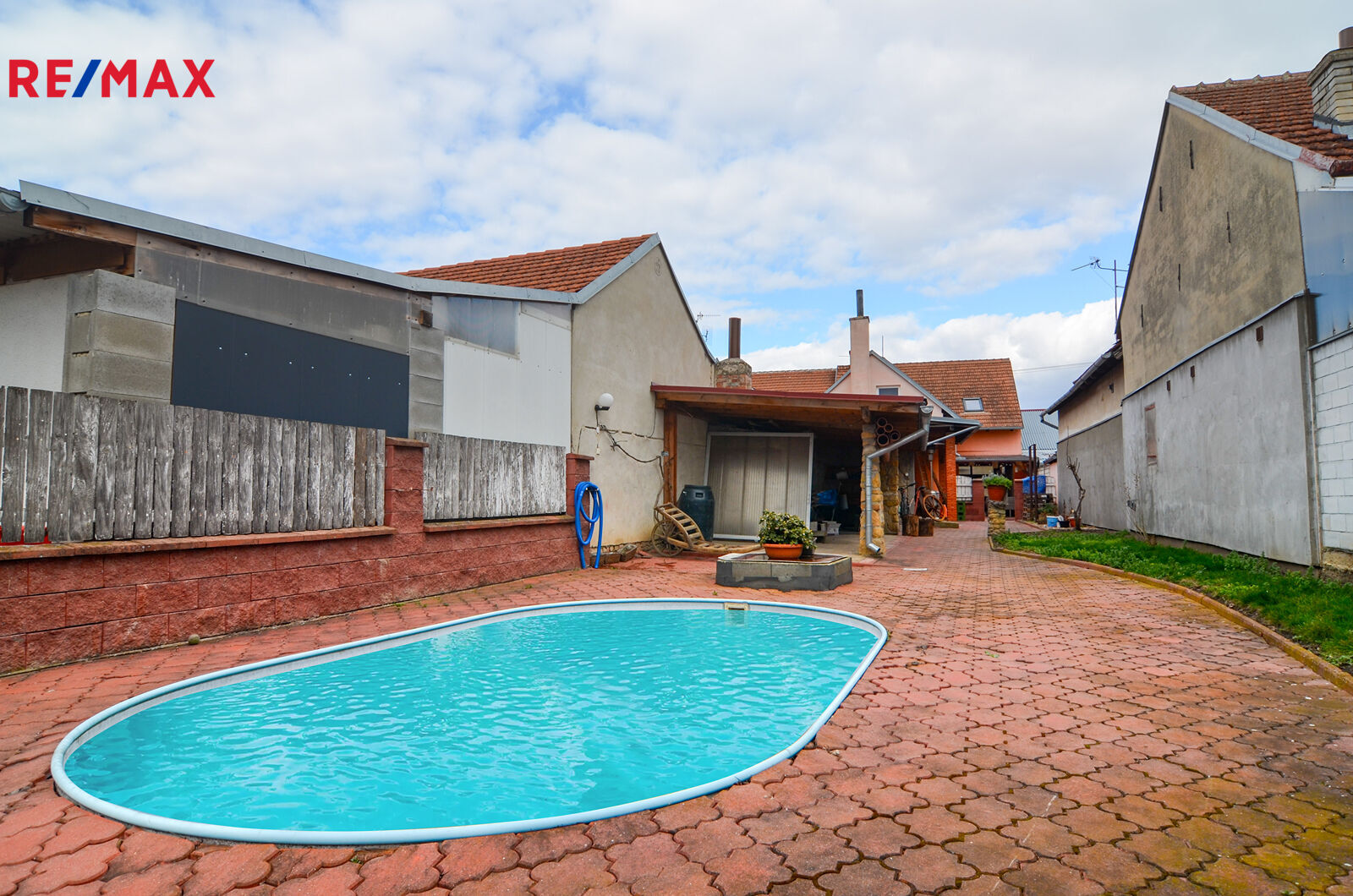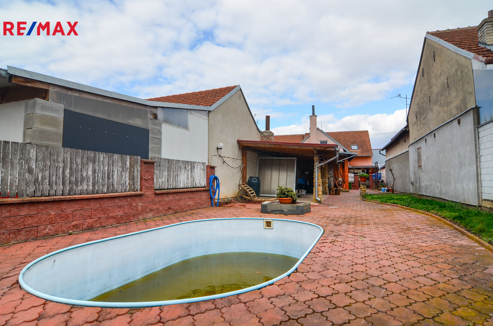 -na obytnou část navazuje dvůr, kde je kůlna, posezení , bazén a dále zahrada