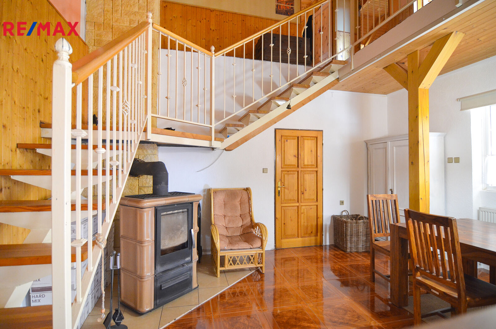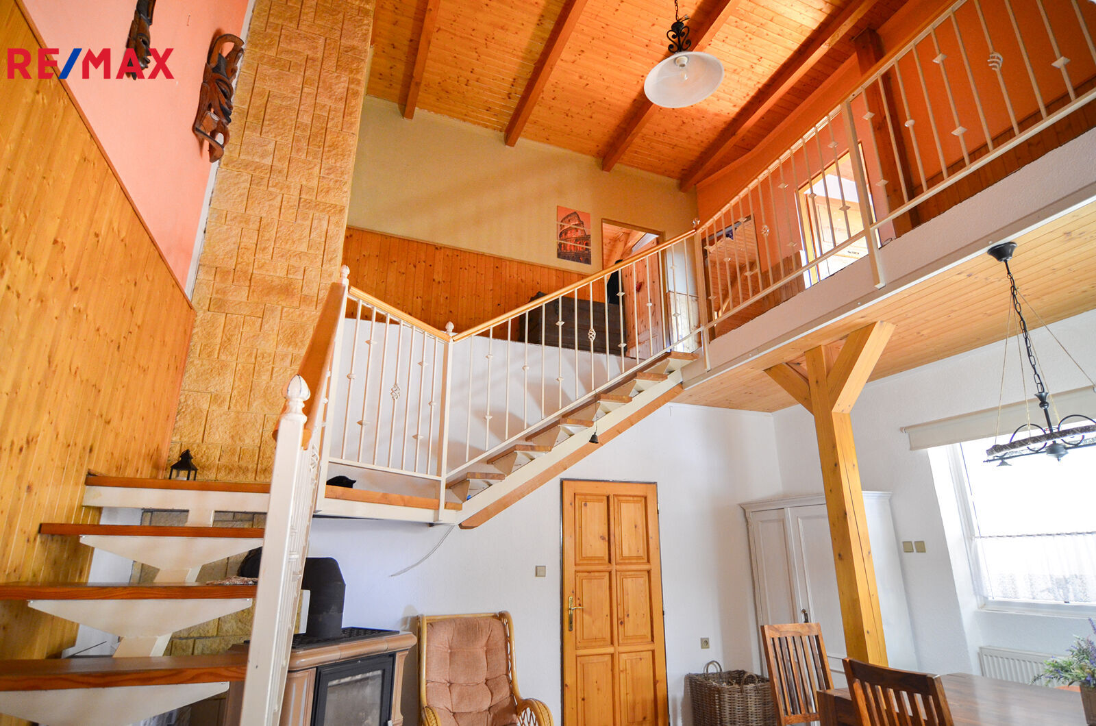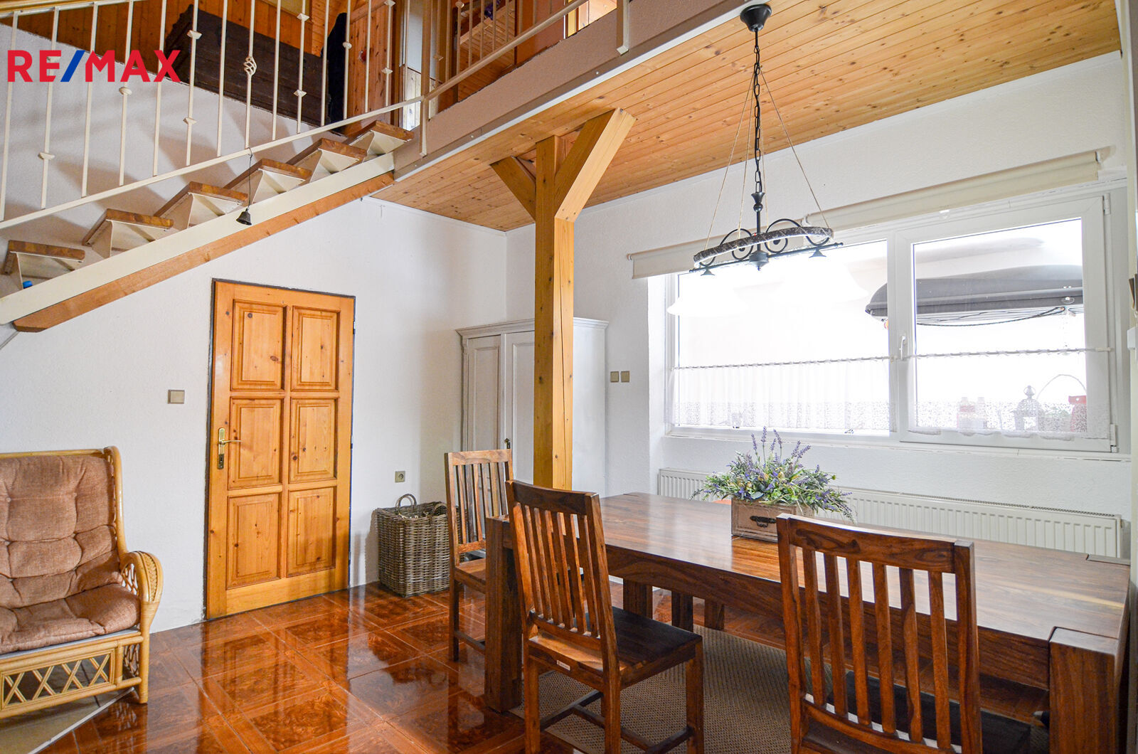 Dominantou obytné části je prostorná jídelna s otevřeným schodištěm do obývacího pokoje a celým obytným podkrovím.