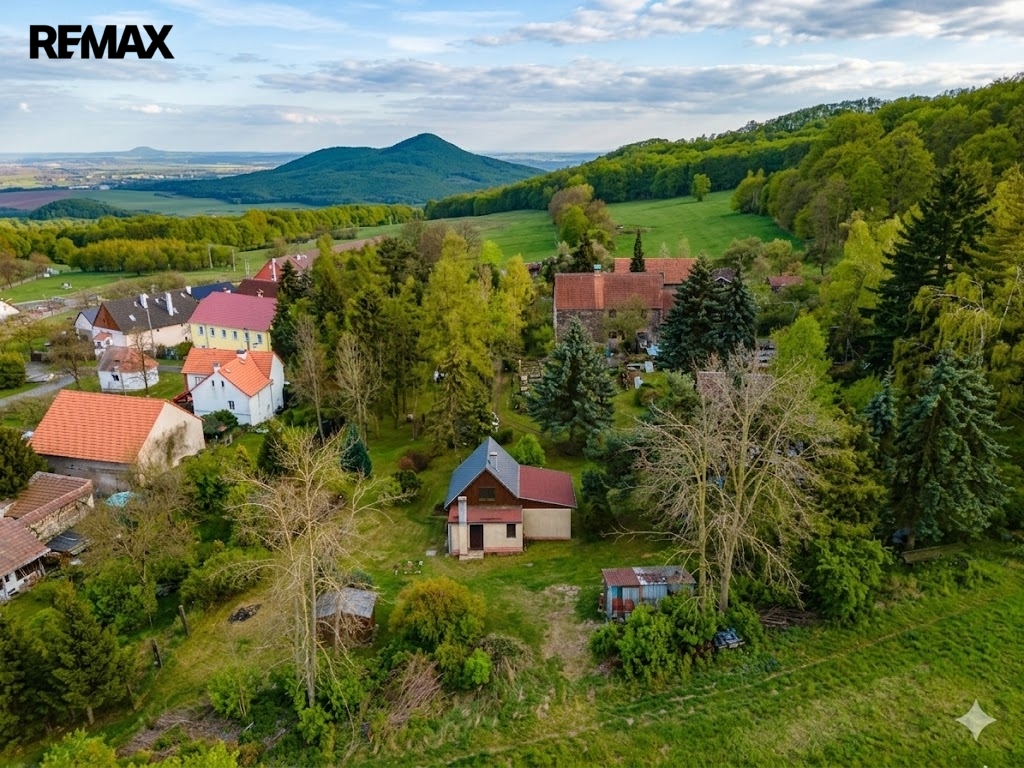 Pozemek nabízí dostatek soukromí pro relaxaci, grilování nebo zahradničení, s výhledem na dominanty Českého středohoří.