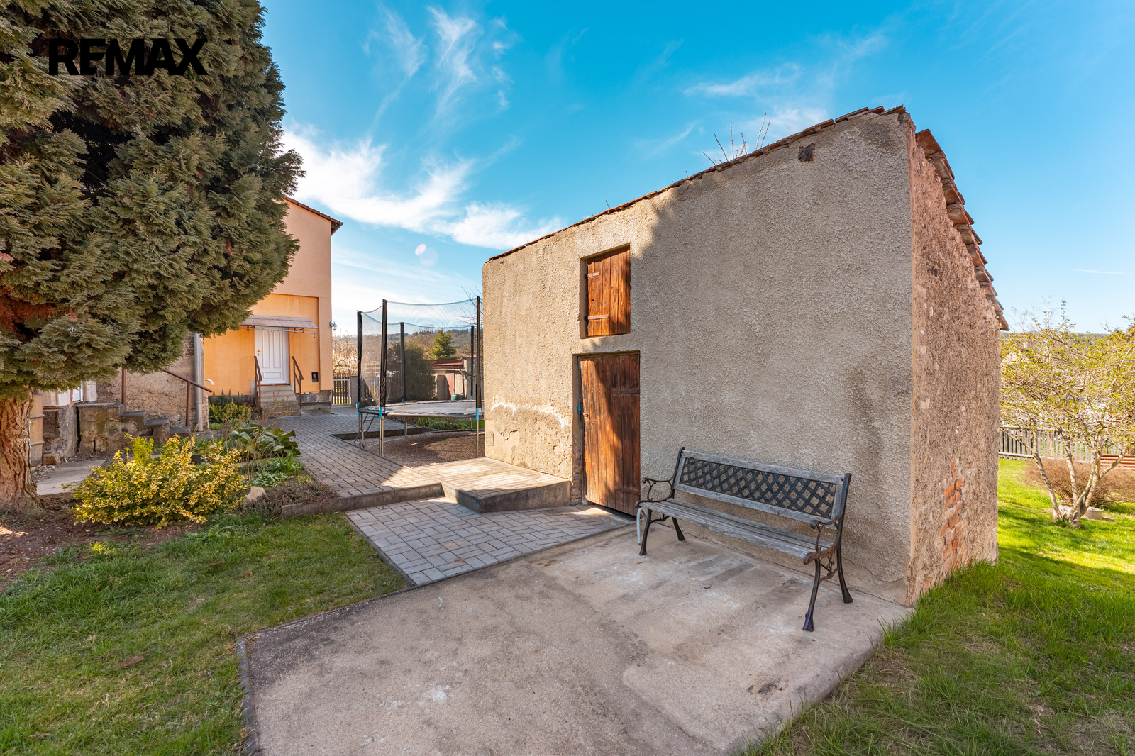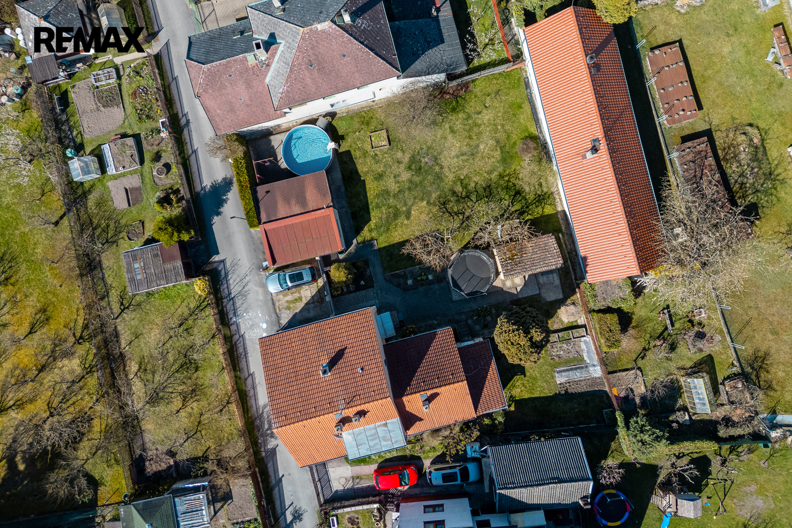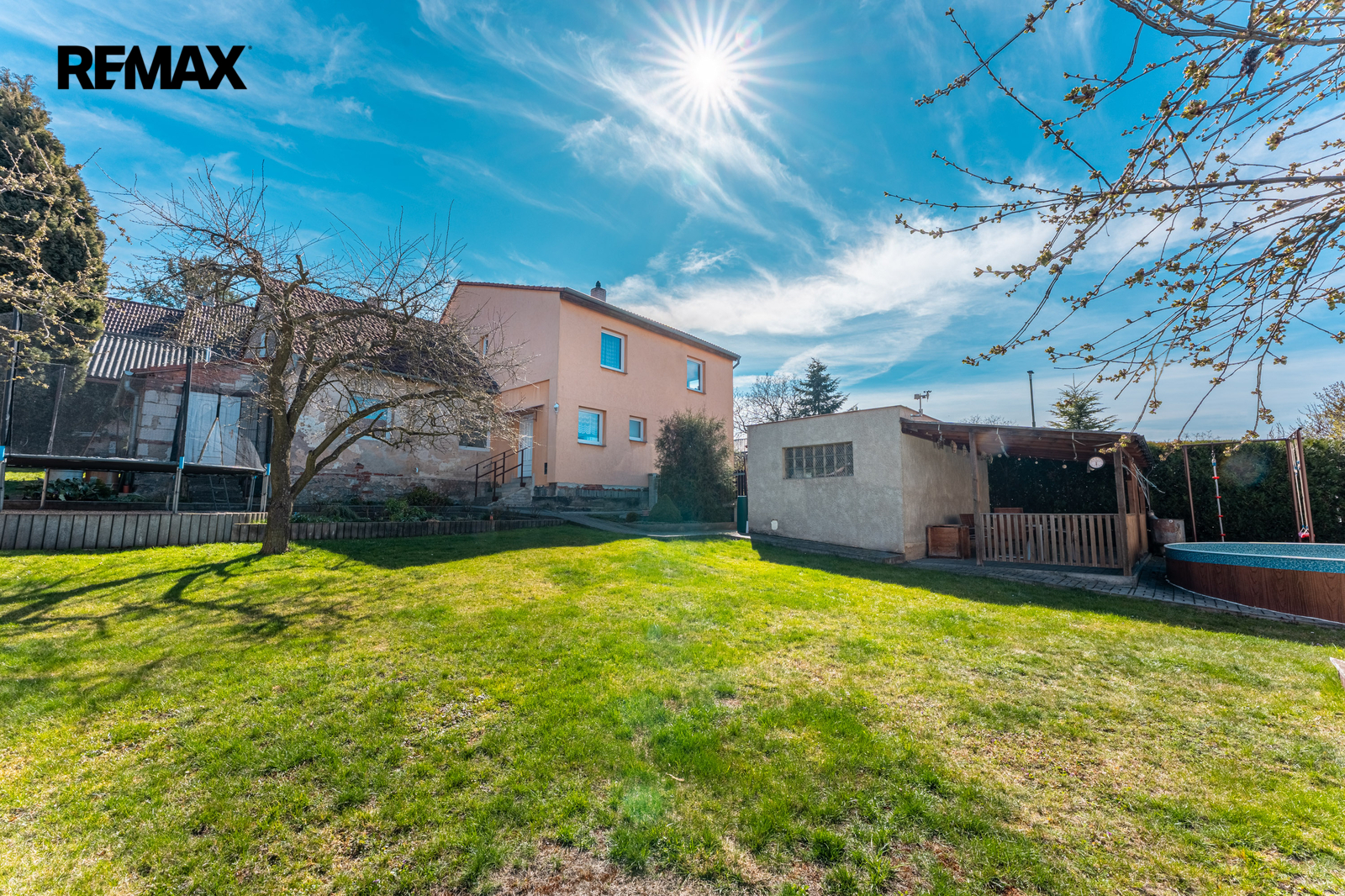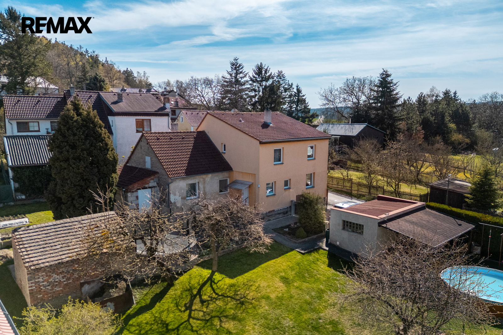 Na pozemku se nachází garáž, pergola, bazén, kůlna a udržovaná zahrada s ovocnými stromy a vzrostlou zelení. Před domem je parkování pro dvě auta na vlastním pozemku, další parkovací možnosti jsou na pozemku.