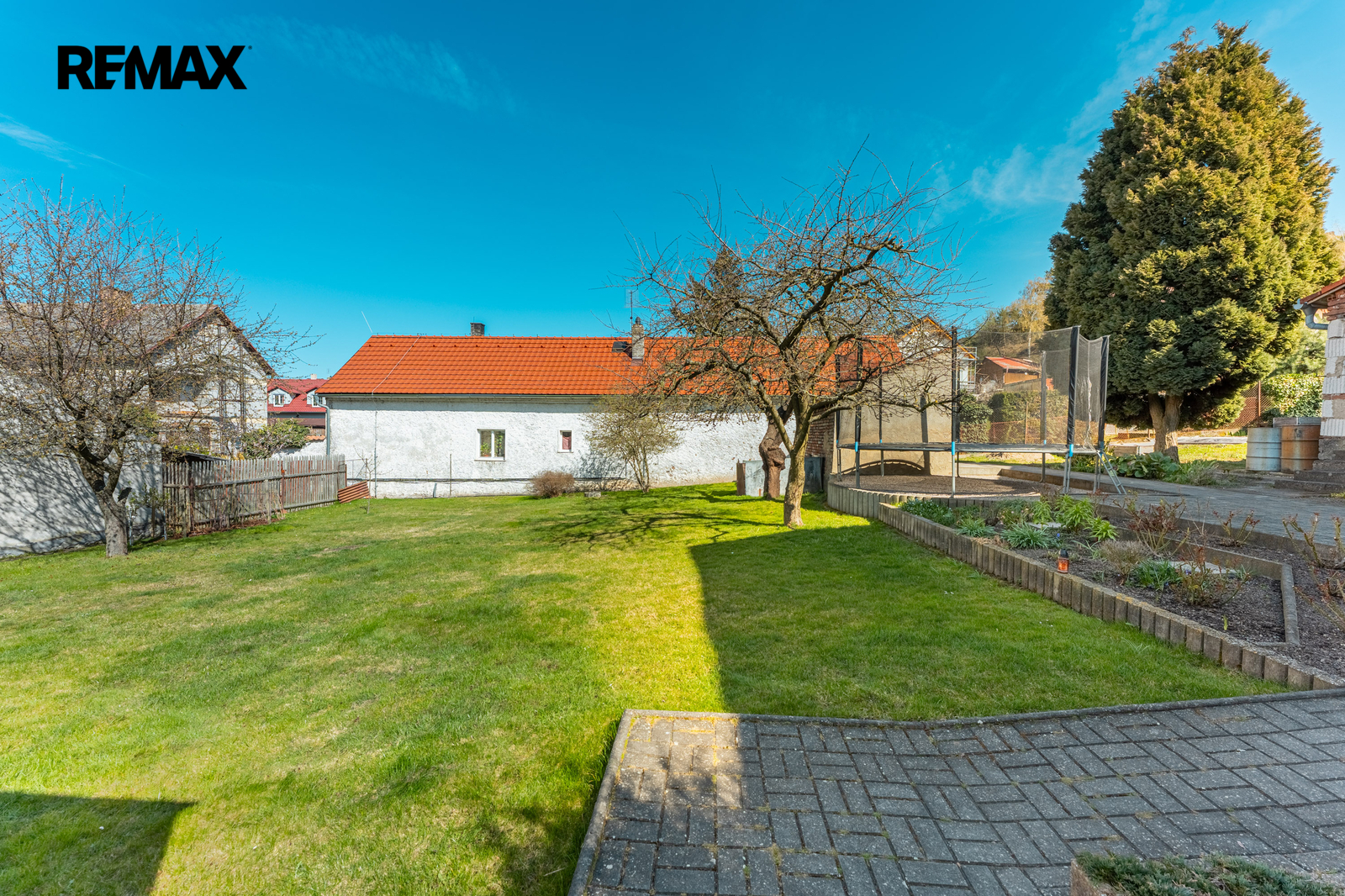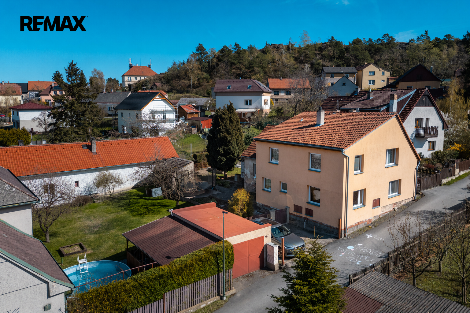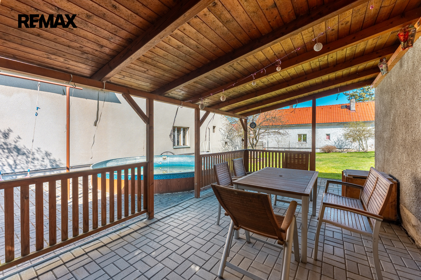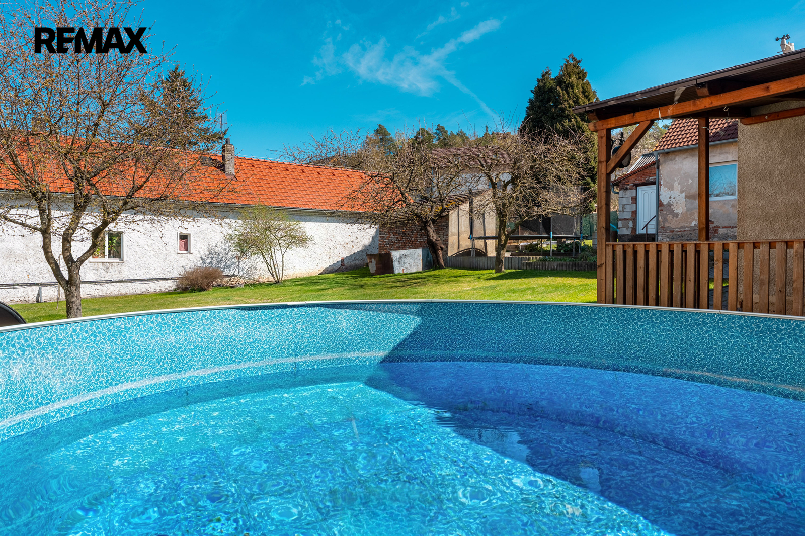 Na pozemku se nachází garáž, pergola, bazén, kůlna a udržovaná zahrada s ovocnými stromy a vzrostlou zelení. Před domem je parkování pro dvě auta na vlastním pozemku, další parkovací možnosti jsou na pozemku.
