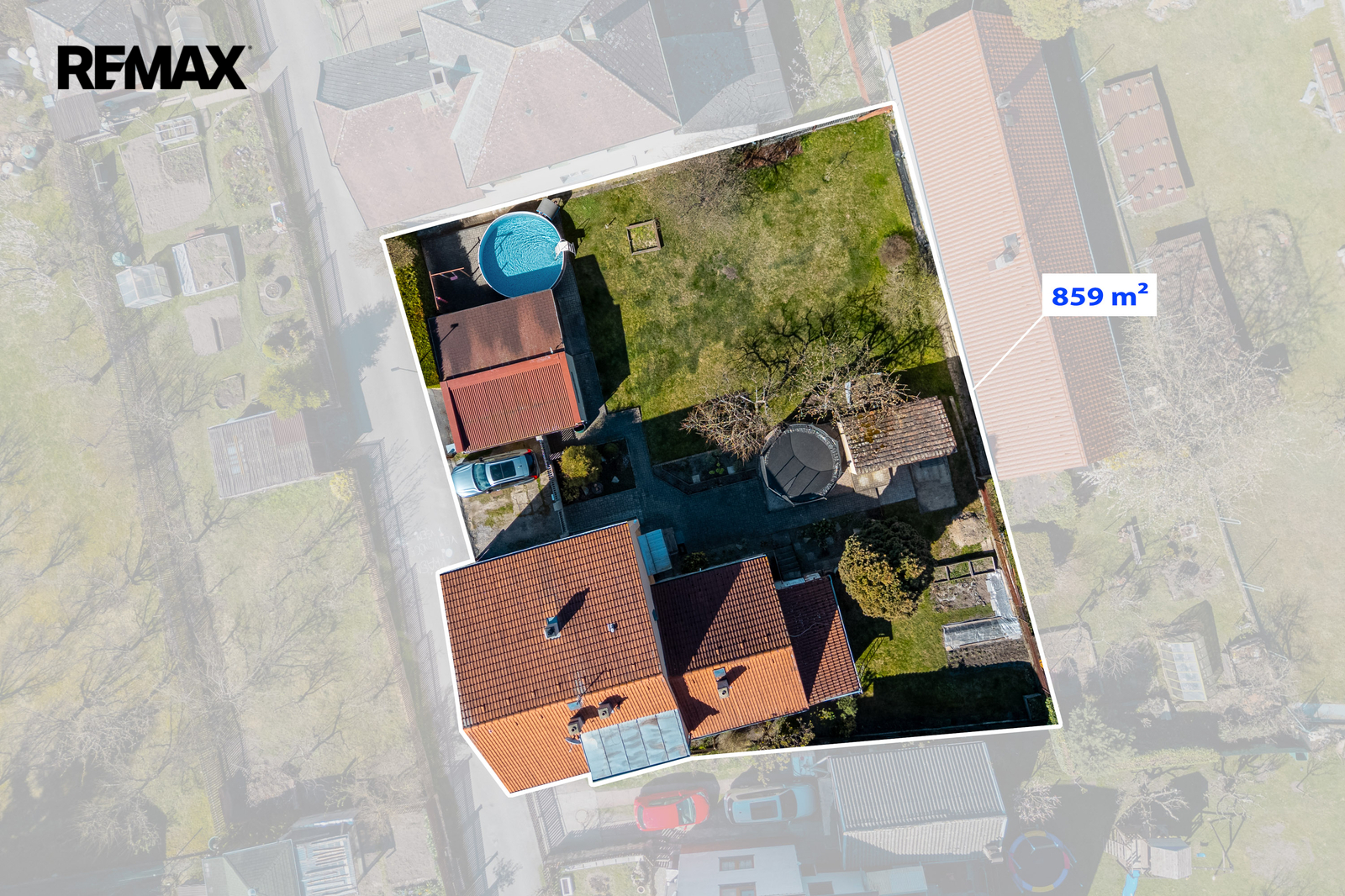 Celková výměra pozemků činí 859 m² (2 parcely). Zastavěná plocha domu je přibližně 128 m².