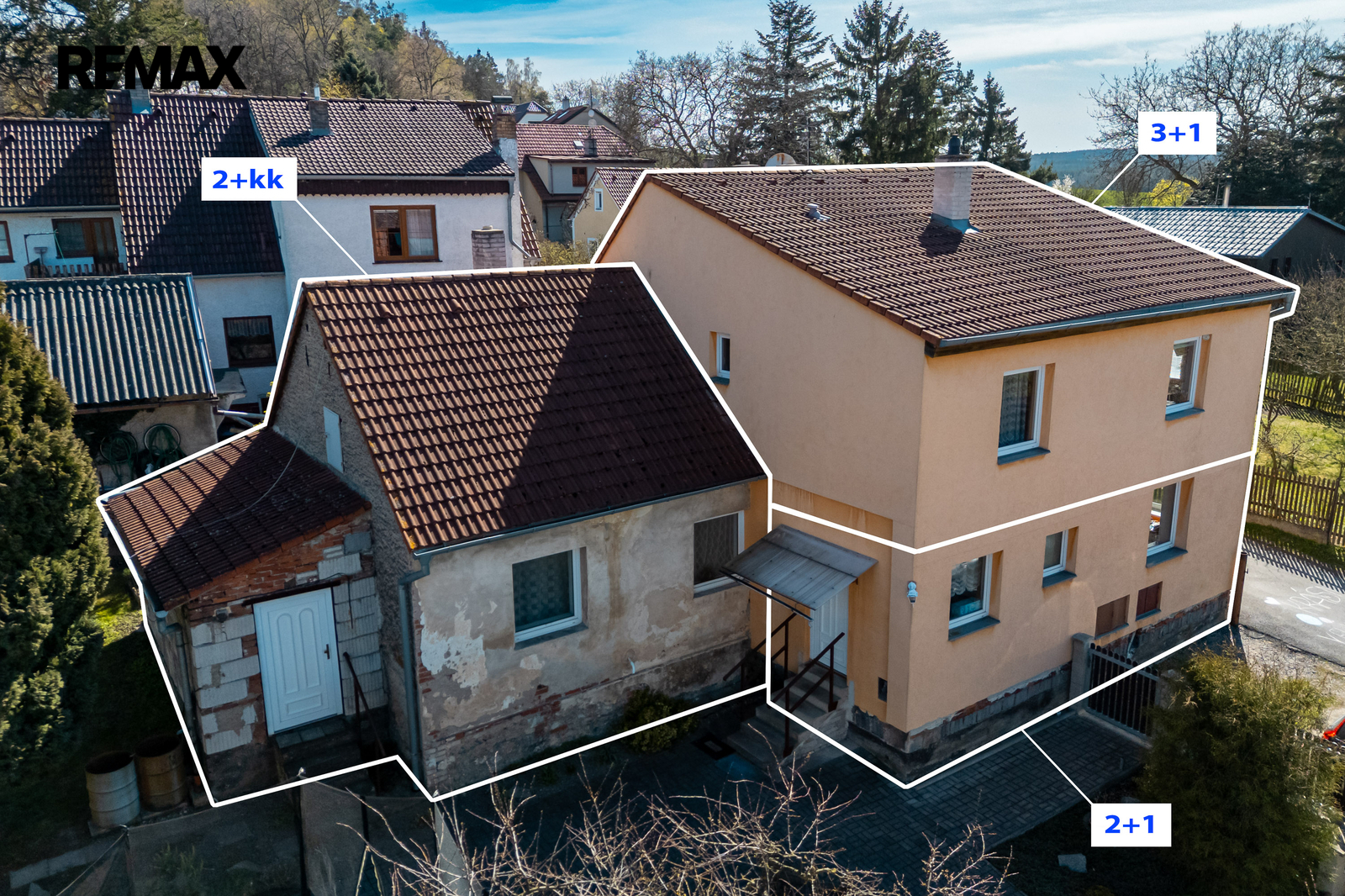 Součástí nemovitosti je také původní část domu se samostatným vstupem, která je určena k rekonstrukci a nabízí potenciál vybudování další bytové jednotky o dispozici 2+1 nebo 3+1 při využití podkroví. Tato část je vhodná jak pro rozšíření bydlení, tak pro pronájem nebo podnikání.