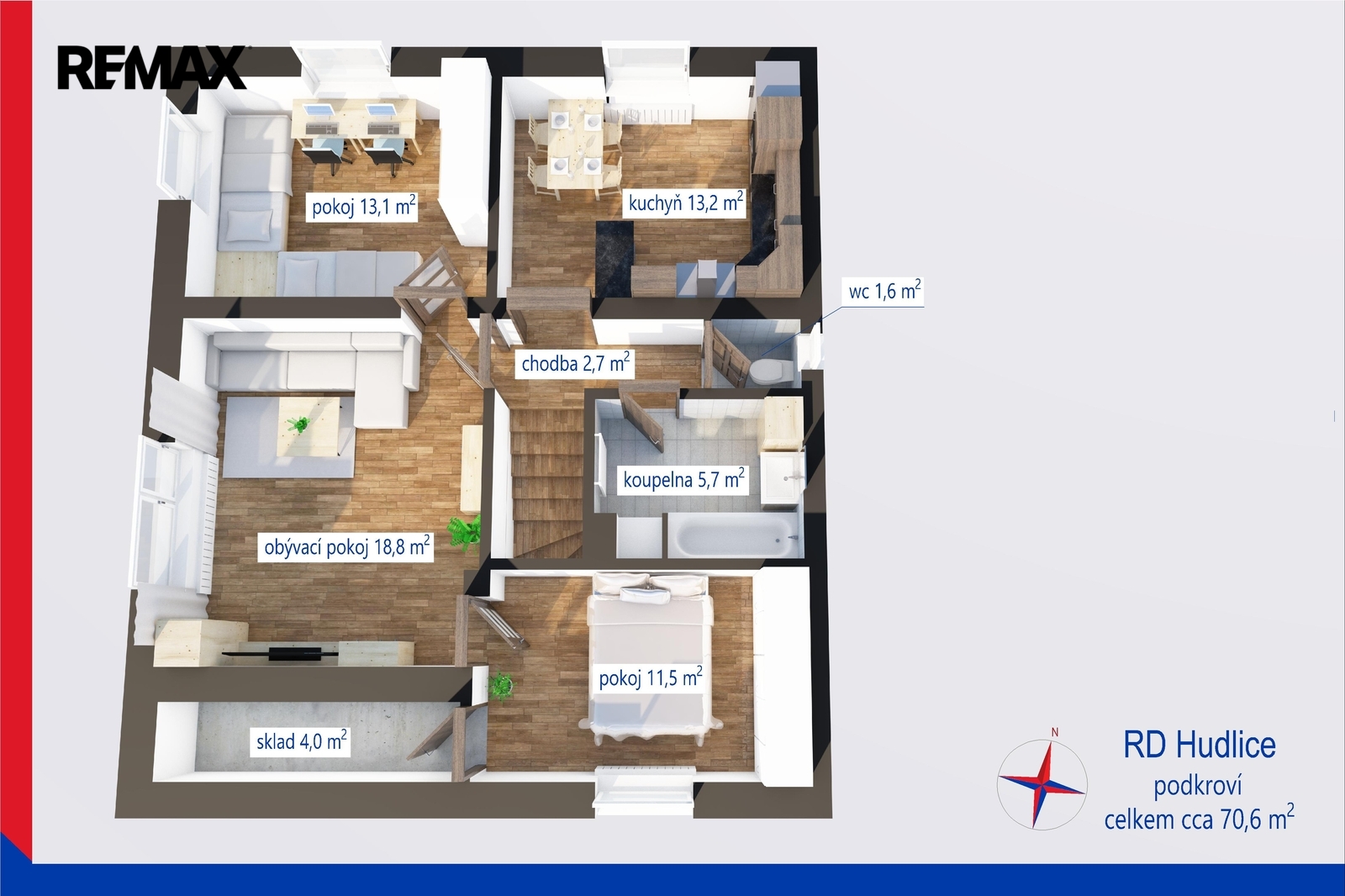 Dům je rozdělen na novou a původní část, což nabízí široké možnosti využití. V nové části domu se ve druhém nadzemním podlaží nachází kompletně zrekonstruovaná bytová jednotka o dispozici 3+1, která je moderní, světlá a bez nutnosti dalších investic. Dispozice zahrnuje vstupní chodbu, samostatné WC, prostornou koupelnu s vanou i sprchovým koutem, obývací pokoj, ložnici, dětský pokoj a kuchyni. Výhodou této jednotky je také možnost rozšíření obytné plochy o půdní prostor nad původní částí domu, čímž lze do budoucna vytvořit ještě velkorysejší bydlení.