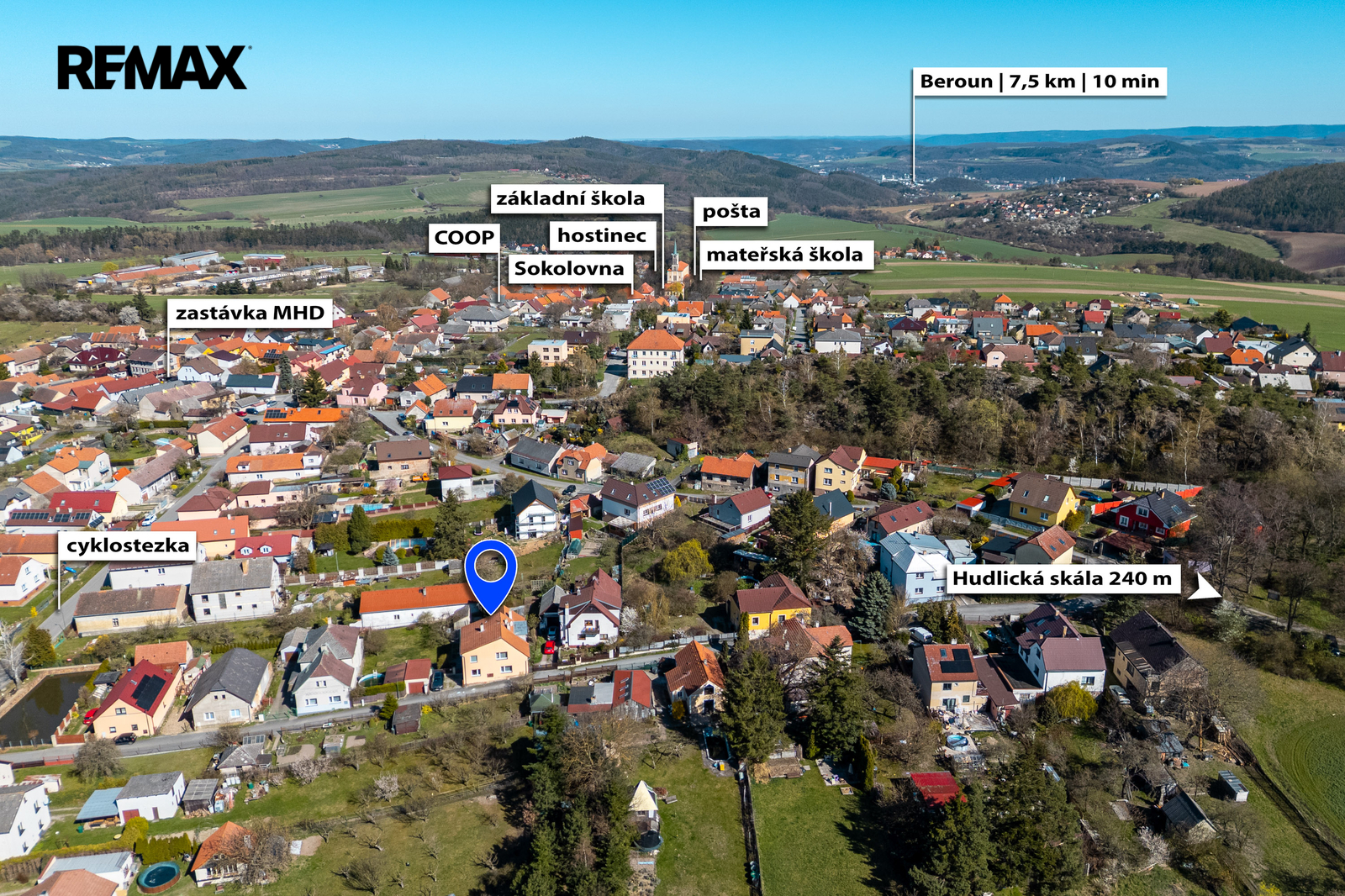 Obec Hudlice je vyhledávanou lokalitou díky spojení přírody a dobré dostupnosti. Nachází se v chráněné krajinné oblasti Křivoklátsko s možností turistiky, cyklovýletů a relaxace v přírodě. Dominantou obce je skalní masiv v blízkosti domu. Beroun a Králův Dvůr jsou vzdáleny jen několik minut jízdy, dálnice D5 zajišťuje rychlé spojení do Prahy.