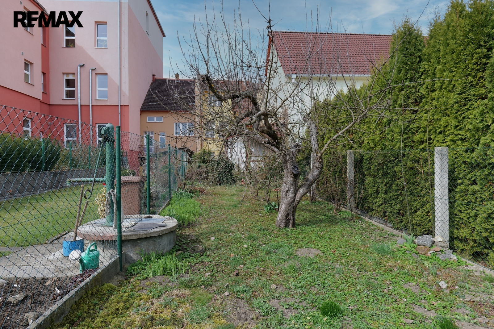Dům je napojený na plyn, kanalizaci i vodovod, na zahradě je ale i kopaná studna společná se sousedy, takže za vodu na zalévání platit nemusíte.