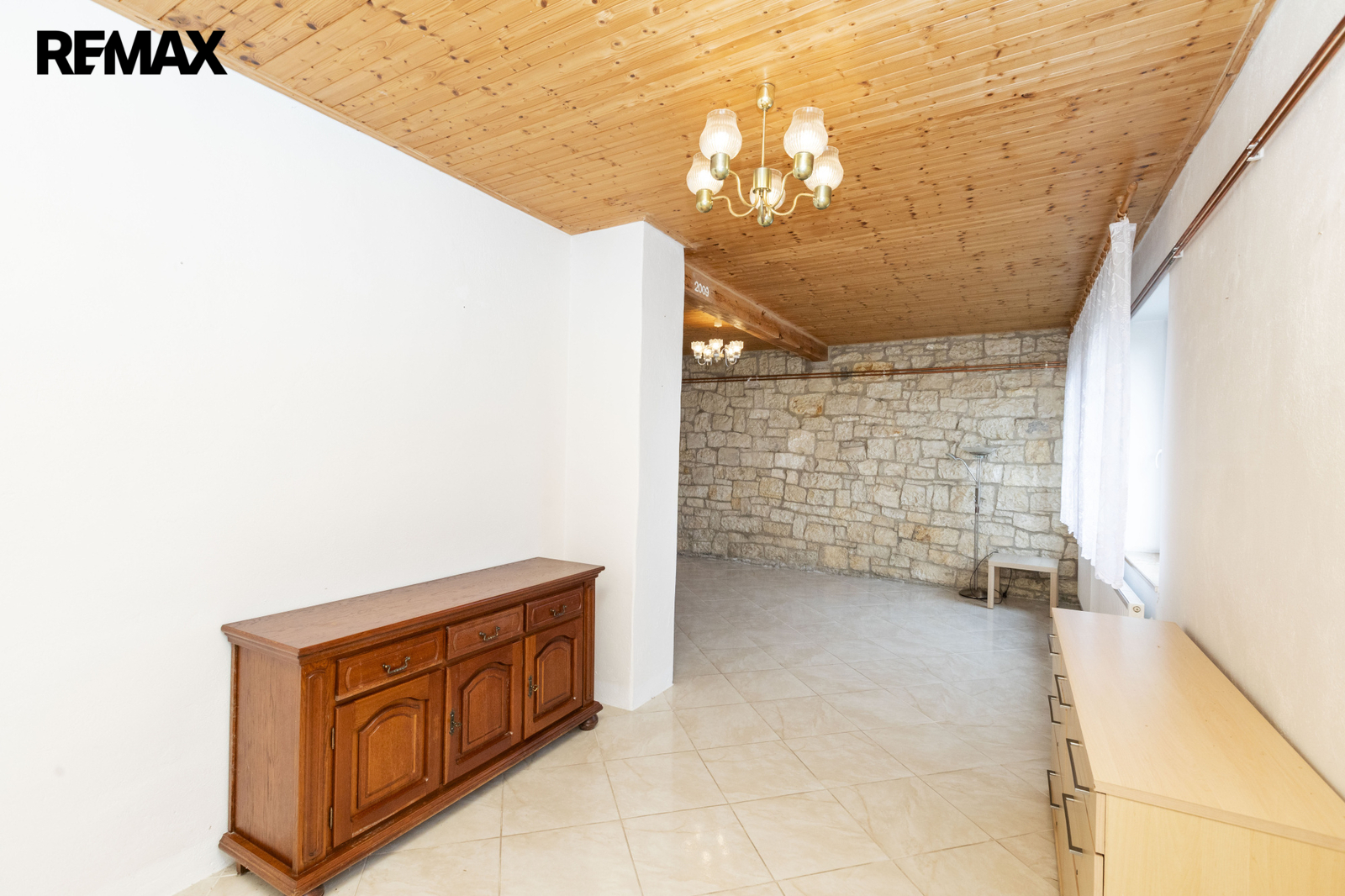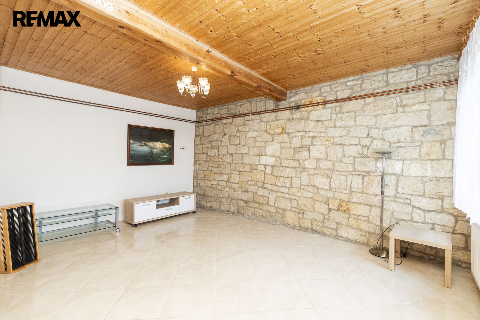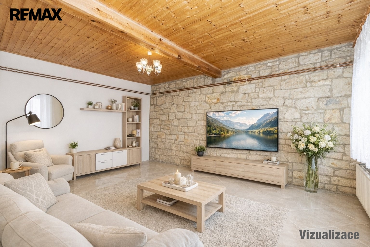 Dispozice domu zahrnuje prostornou kuchyni o velikosti 15 m², která poskytuje dostatek místa jak pro vaření, tak pro společné stolování. Koupelna o výměře 8 m² je vybavena tak, aby odpovídala současným standardům. Dominantou přízemí je velký obývací pokoj o ploše 32 m², ve kterém zaujme kamenná stěna dodávající prostoru osobitý charakter.